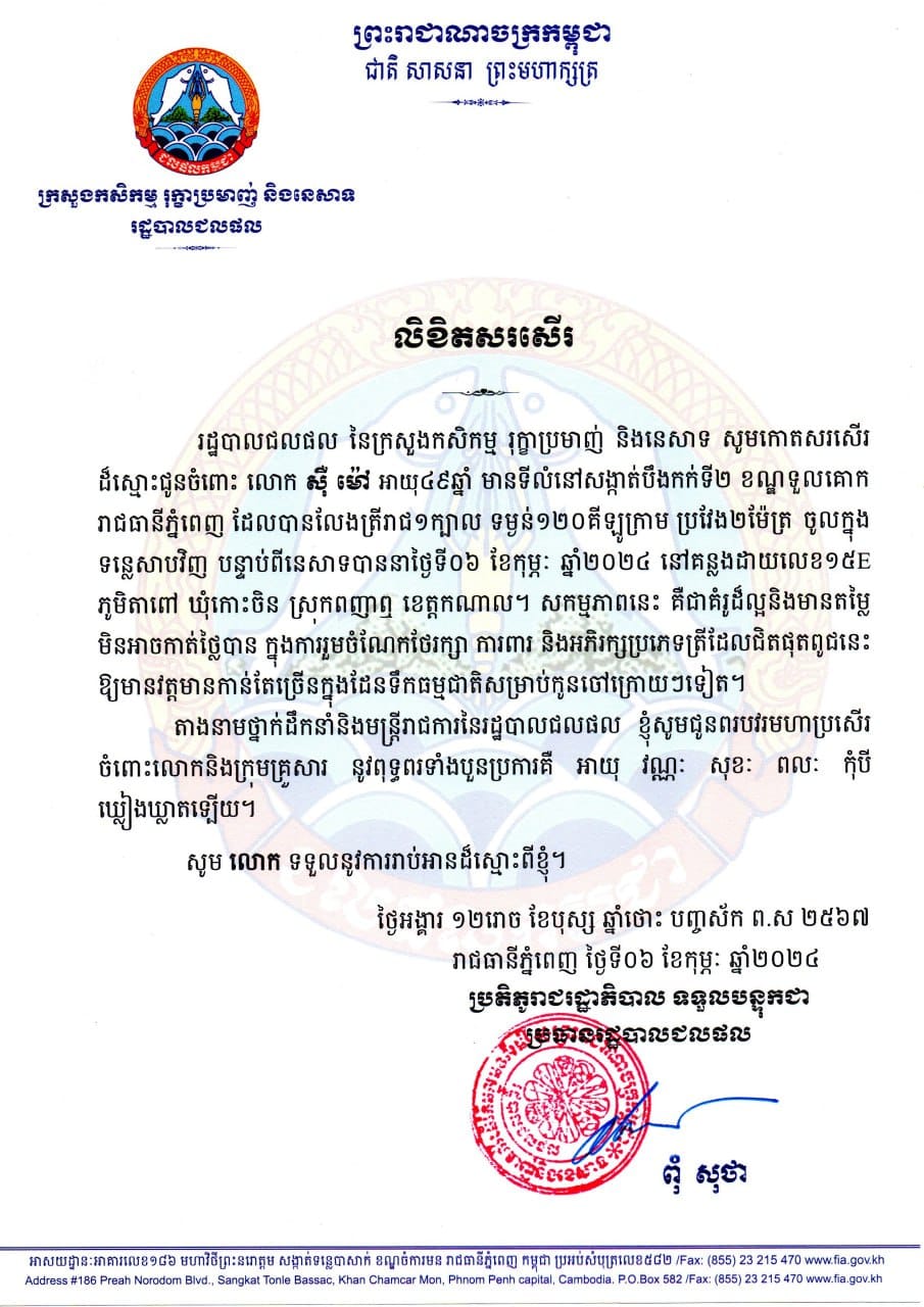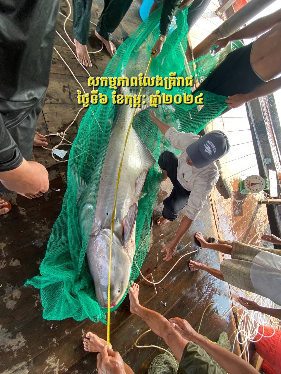 ខេត្តកណ្តាល៖ នៅថ្ងៃទី០៨ ខែកុម្ភៈ ឆ្នាំ២០២៤ យោងតាមការចុះផ្សាយរបស់ រដ្ឋបាលជលផល បានឱ្យដឹងថា រដ្ឋបាលជលផលនៃក្រសួងកសិកម្ម រុក្ខាប្រមាញ់ និងនេសាទ សូមកោតសរសើរដ៏ស្មោះ និងថ្លៃងអំណរគុណចំពោះ លោក ស៊ឺ ម៉ៅ ដែលបានលែងត្រីរាជ ១ក្បាល ទម្ងន់ ១២០គីឡូក្រាម ប្រវែង២ម៉ែត្រ ចូលក្នុងទន្លេសាបវិញ បន្ទាប់ពីនេសាទបាននាថ្ងៃទី០៦ ខែកុម្ភៈ ឆ្នាំ២០២៤ នៅភូមិតាពៅ ឃុំកោះចិន ស្រុកពញា ខេត្តកណ្តាល។