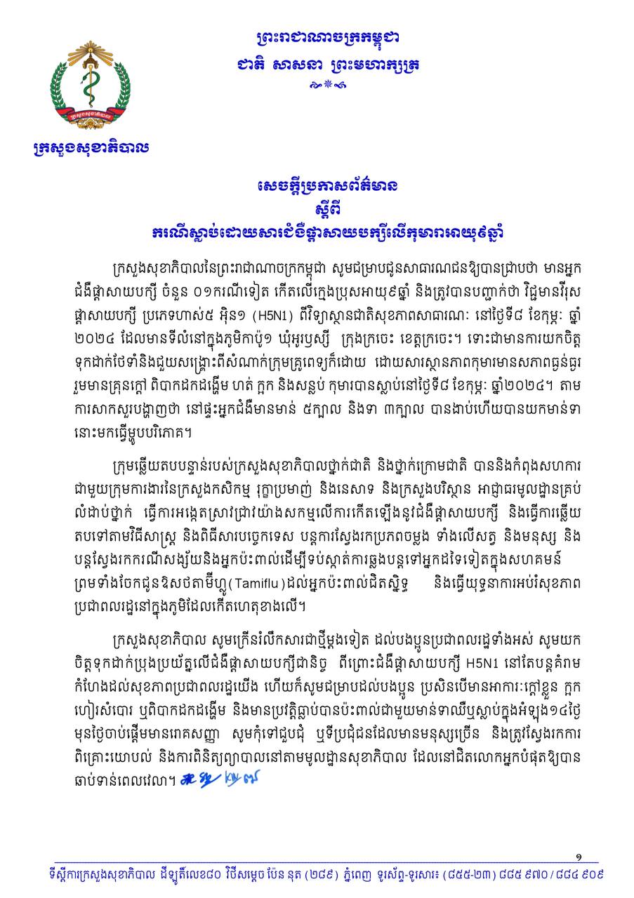 រាជធានីភ្នំពេញ៖ នៅថ្ងៃទី០៩ ខែកុម្ភៈ ឆ្នាំ២០២៤ យោងតាមការចុះផ្សាយរបស់ ក្រសួងសុខាភិបាល បានចេញសេចក្ដី ប្រកាសព័ត៌មាន ស្តីពីករណីបាត់បង់ជីវិត ដោយសារជំងឺផ្តាសាយបក្សីលើកុមារាអាយុ ៩ឆ្នាំ នៅក្នុងភូមិកាប៉ូ១ ឃុំអូរឫស្សី ក្រុងក្រចេះ ខេត្តក្រចេះ។