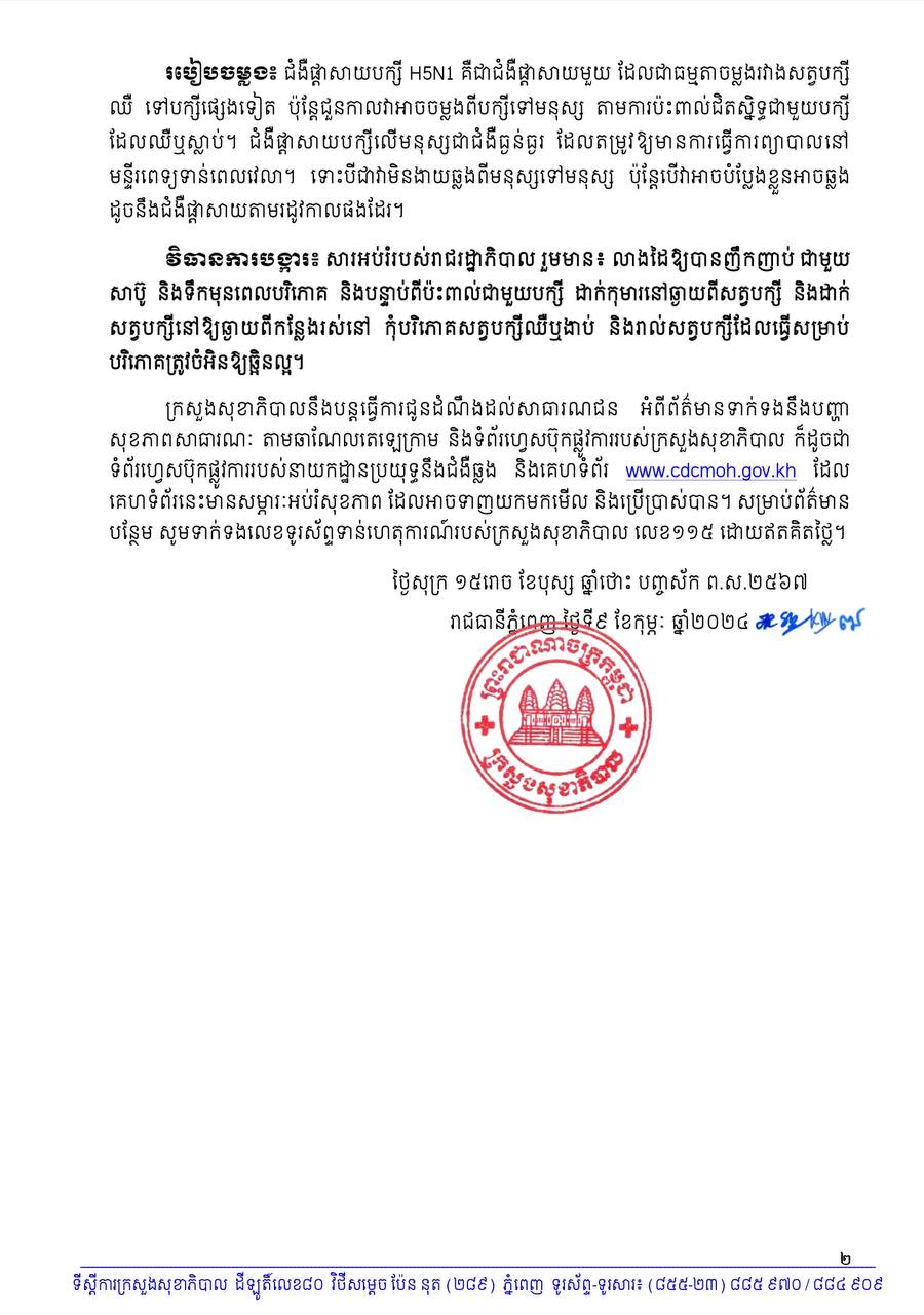 ក្រសួងសុខាភិបាល សូមជម្រាបជូនសាធារណជនឱ្យបានជ្រាបថា មានអ្នកជំងឺផ្តាសាយបក្សី ចំនួន ០១ករណីទៀត កើតលើក្មេងប្រុសអាយុ៩ឆ្នាំ និងត្រូវបានបញ្ជាក់ថា វិជ្ជមានវីរុស ផ្តាសាយបក្សី ប្រភេទហាស់៥ អ៊ុន១ (H5N1) ពីវិទ្យាស្ថានជាតិសុខភាពសាធារណៈ នៅថ្ងៃទី៨ ខែកុម្ភៈ ឆ្នាំ ២០២៤ ដែលមានទីលំនៅក្នុងភូមិកាប៉ូ១ ឃុំអូរឫស្សី ក្រុងក្រចេះ ខេត្តក្រចេះ។ ទោះជាមានការយកចិត្ត ទុកដាក់ថែទាំនិងជួយសង្គ្រោះពីសំណាក់ក្រុមគ្រូពេទ្យក៏ដោយ ដោយសារស្ថានភាពកុមារមានសភាពធ្ងន់ធ្ងរ រួមមានគ្រុនក្តៅ ពិបាកដកដង្ហើម ហត់ ក្អក និងសន្លប់ កុមារបានស្លាប់នៅថ្ងៃទី៨ ខែកុម្ភៈ ឆ្នាំ២០២៤។ តាមការសាកសួរបង្ហាញថា នៅផ្ទះអ្នកជំងឺមានមាន់ ៥ក្បាល និងទា ៣ក្បាល បានងាប់ហើយបានយកមាន់ទា នោះមកធ្វើម្ហូបបរិភោគ។