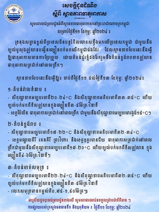 (រាជធានីភ្នំពេញ)៖ នៅថ្ងៃទី១១ ខែកុម្ភៈ ឆ្នាំ២០២៤ យោងតាមការចុះផ្សាយរបស់ ក្រសួងធនធានទឹក និងឧតុនិយម បានឱ្យដឹងថា ទ្រនុងសម្ពាធខ្ពស់ពីប្រទេសចិនបន្តរំកិលលាតសន្ធឹងមកលើប្រទេសកម្ពុជា ជាមួយនឹងខ្យល់មូសុងឦសានបង្កើនល្បឿនបក់មកលើកម្ពុជាផងដែរ ដែលស្ថានភាពបែបនេះនឹងធ្វើឱ្យធាតុអាកាសមានការប្រែប្រួល ដោយតំបន់ជួរភ្នំដងរែករួមនឹងតំបន់ខ្ពង់រាបភាគឦសានធាតុអាកាសត្រជាក់នៅពេលព្រឹក។