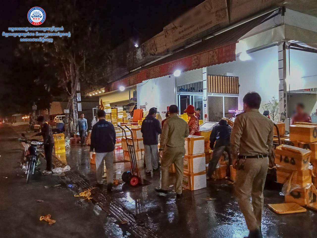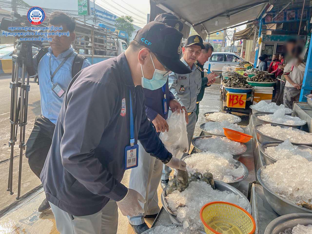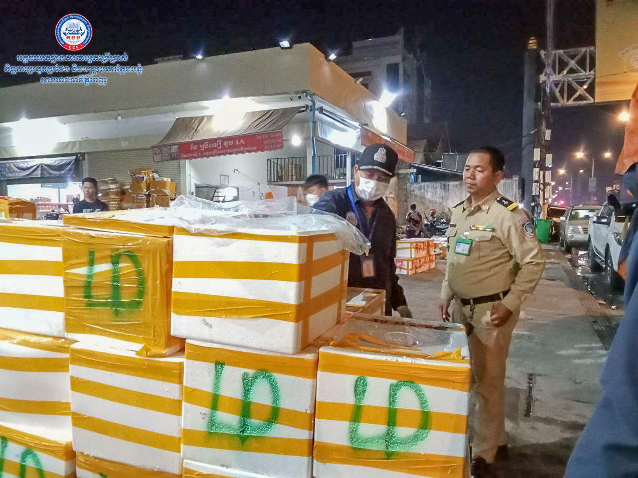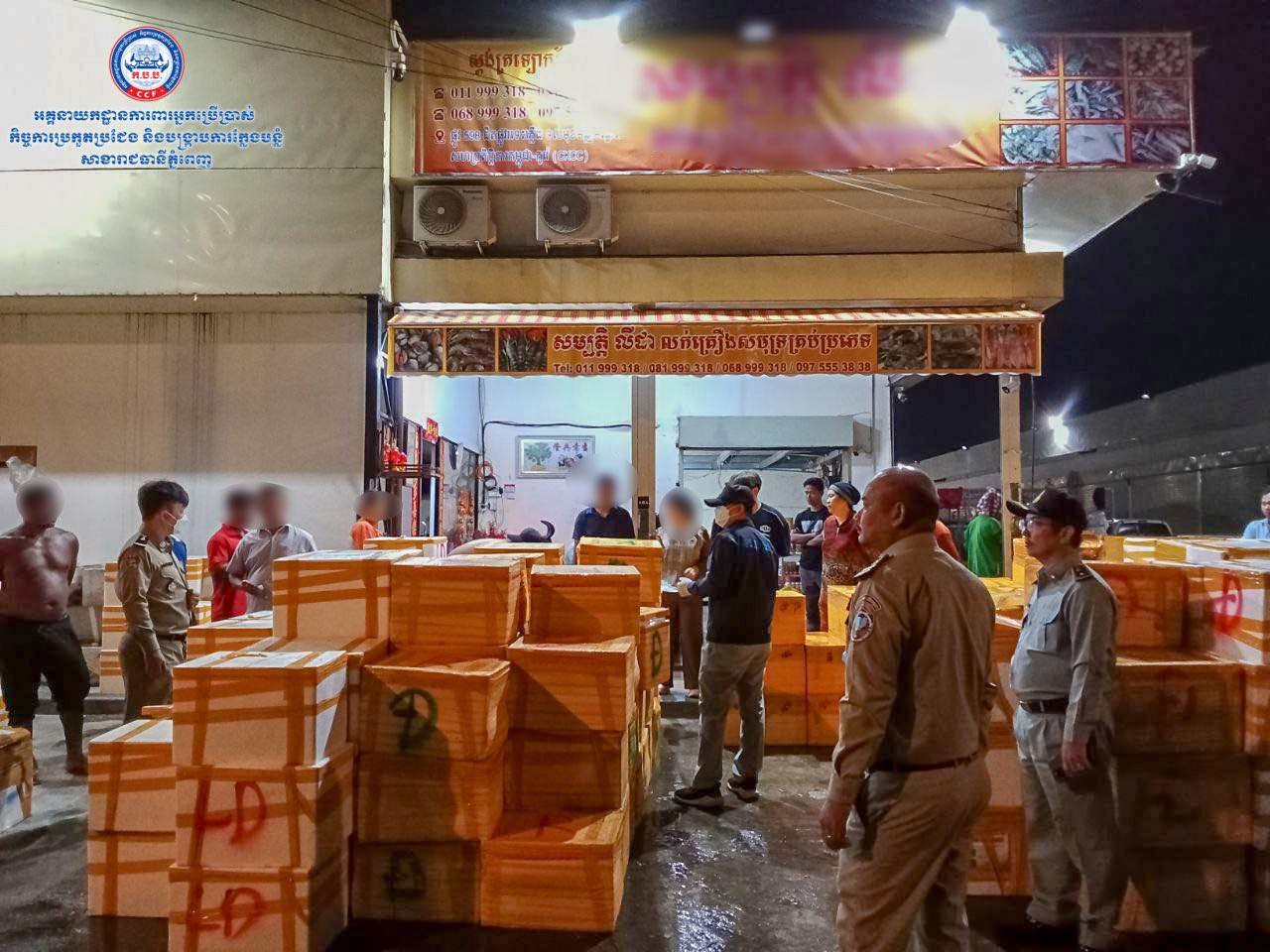 មន្ត្រីជំនាញ«ក.ប.ប.» រកឃើញបង្គាមានចាក់ចាហួយប្រមាណជាង ៤តោន នៅទីតាំងលក់គ្រឿងសមុទ្រ តំបន់ត្រឡោកបែក