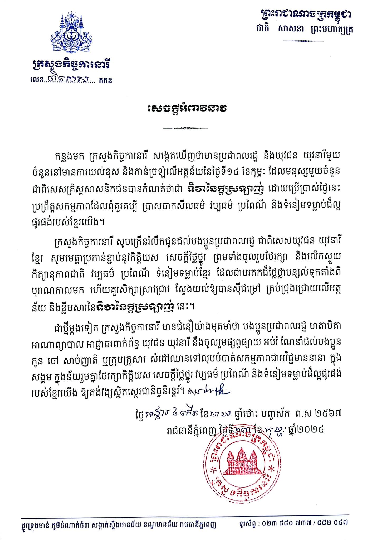 ក្រសួងកិច្ចការនារី អំពាវនាវកុំយកថ្ងៃទី១៤ កុម្ភៈ «ទិវានៃក្តីស្រឡាញ់» ប្រព្រឹត្តទង្វើពុំគួរគប្បី ប្រាស់ចាកសីលធម៌ វប្បធម៌ ប្រពៃណី និងទំនៀមទម្លាប់ដ៏ល្អផូរផង់របស់ខ្មែរ
