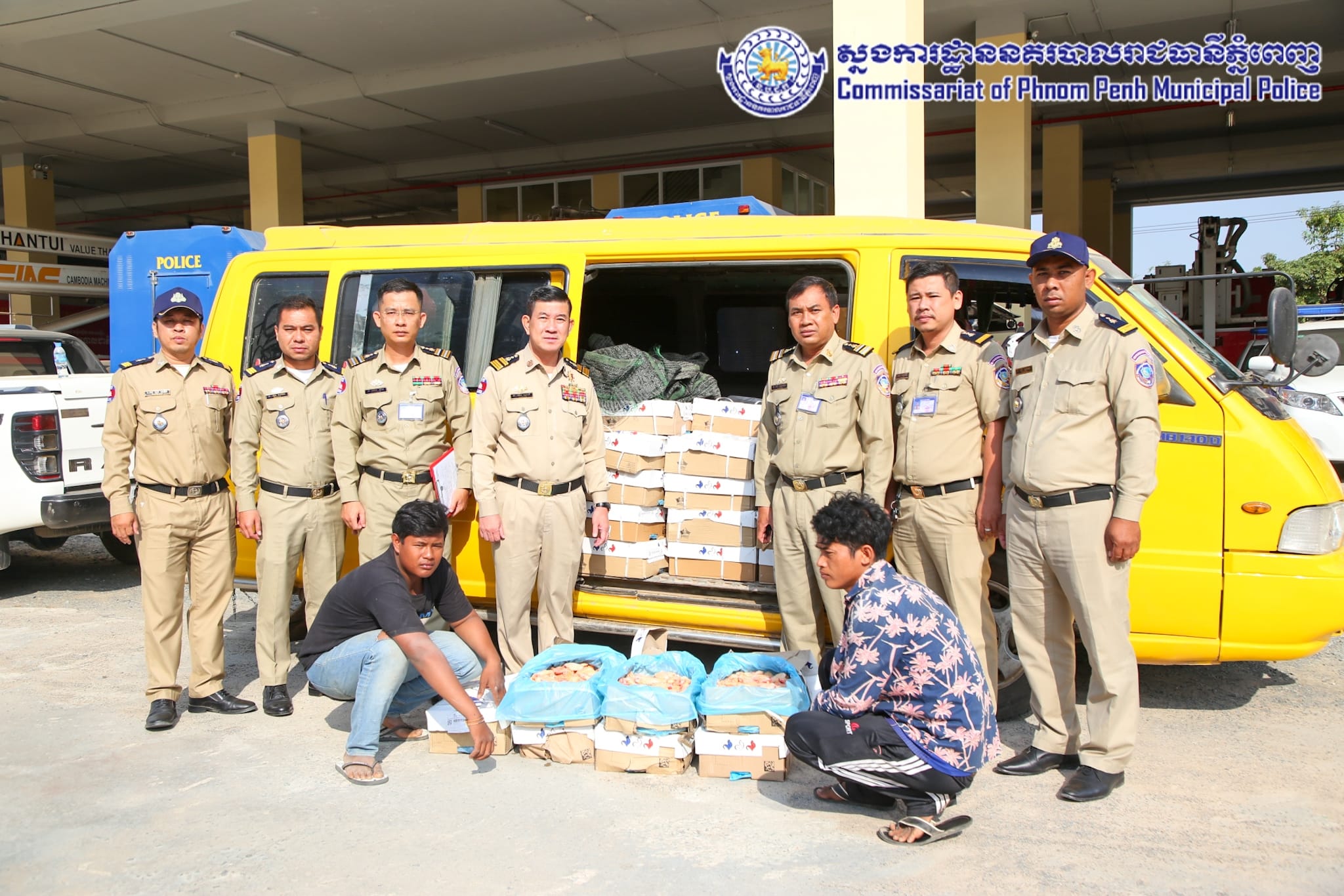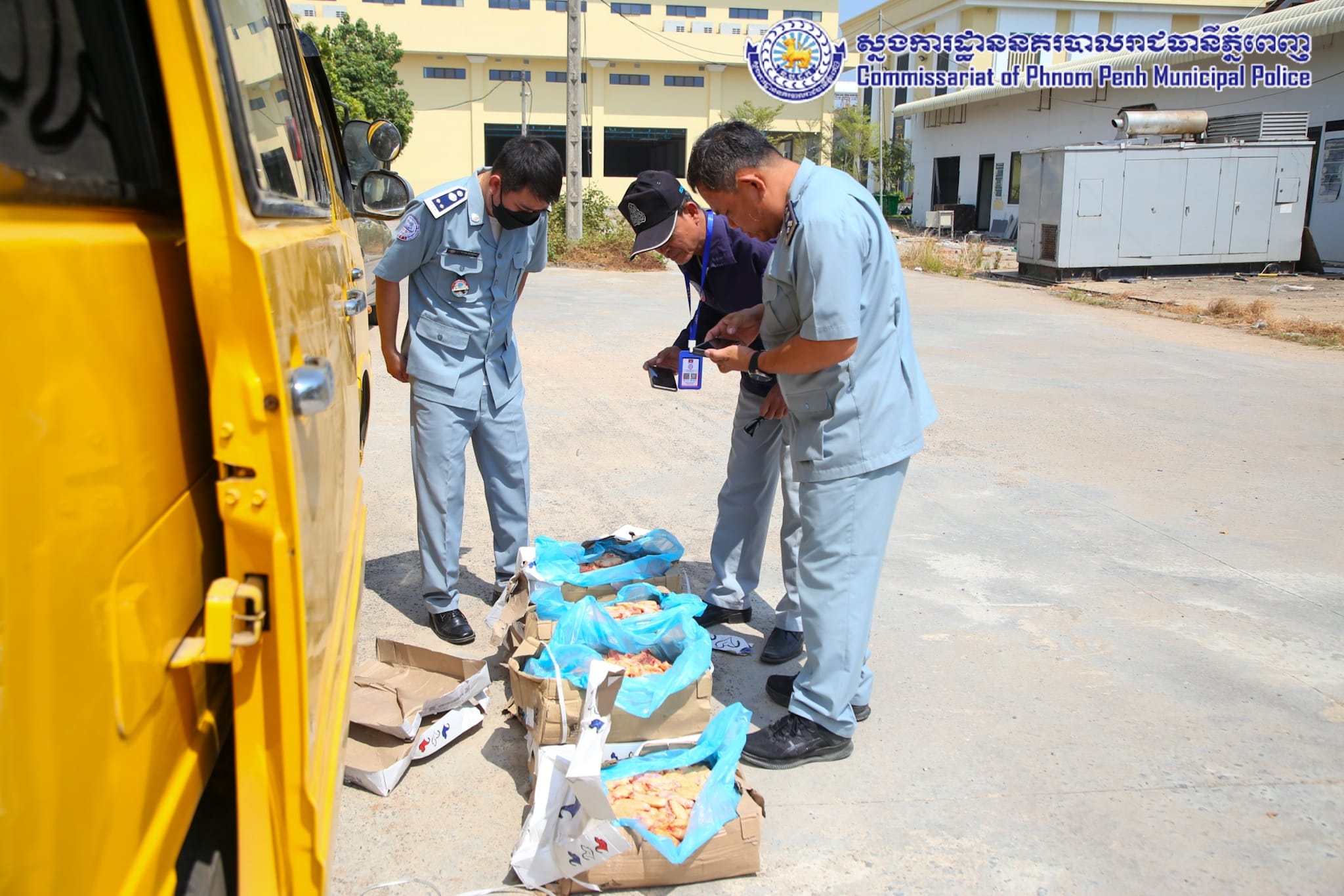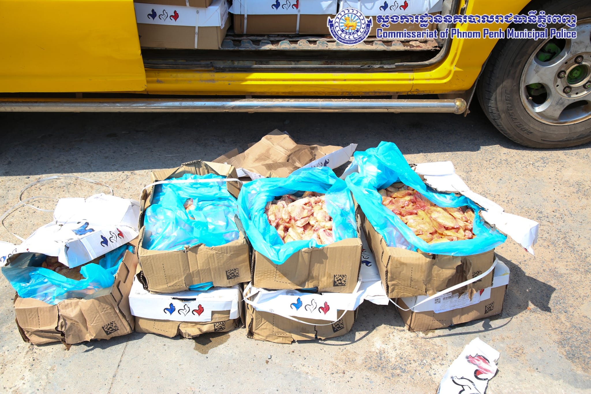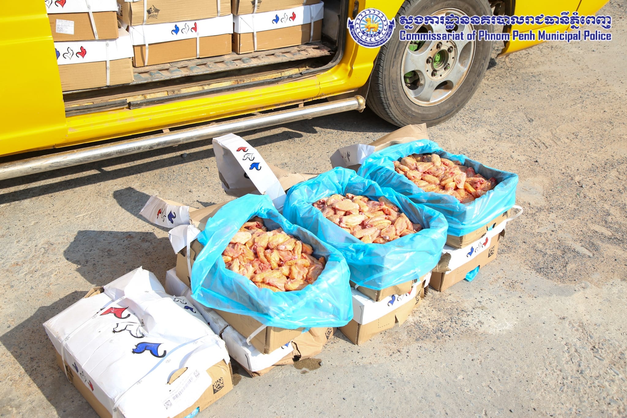 ដោយអនុវត្តតាមបទបញ្ជារបស់ឯកឧត្តម ឧត្តមសេនីយ៍ឯក ជួន ណារិន្ទ អគ្គស្នងការរង និងជាស្នងការនគរបាលរាជធានីភ្នំពេញ នៅថ្ងៃទី១៤ ខែកុម្ភៈ ឆ្នាំ២០២៤ កម្លាំងការិយាល័យនគរបាលប្រឆាំងបទល្មើសសេដ្ឋកិច្ច ដឹកនាំបង្ក្រាបដោយលោកឧត្តមសេនីយ៍ទោ ពិត បញ្ញា ស្នងការរង ទទួលផែនការងារនគរបាលប្រឆាំងបទល្មើសសេដ្ឋកិច្ច និងលោកឧត្តមសេនីយ៍ត្រី ជុំ ណារ័ត្ន អនុផែនការងារ និងលោកវរសេនីយ៍ឯក យឹម សុជាតិ នាយការិយាល័យនគរបាលប្រឆាំងបទល្មើសសេដ្ឋកិច្ច សហការជាមួយ ក.ប.ប. រាជធានីភ្នំពេញ បានធ្វើបង្ក្រាបស្លាបមាន់ ខូចគុណភាព ចំនួន២០០កេស ស្មើនឹង ២,០០០គីឡូក្រាម គ្មានឯកសារបញ្ជាក់ពីប្រភពច្បាស់លាល់ និងមិនអនុលោមភាពផ្នែកបទដ្ឋានព័ត៌មានលក្ខខ័ណ្ឌតម្រូវម្ហូបអាហារ ដែលធ្វើឱ្យប៉ះពាល់ដល់សុខភាពប្រជាពលរដ្ឋជាអ្នកប្រើប្រាស់។