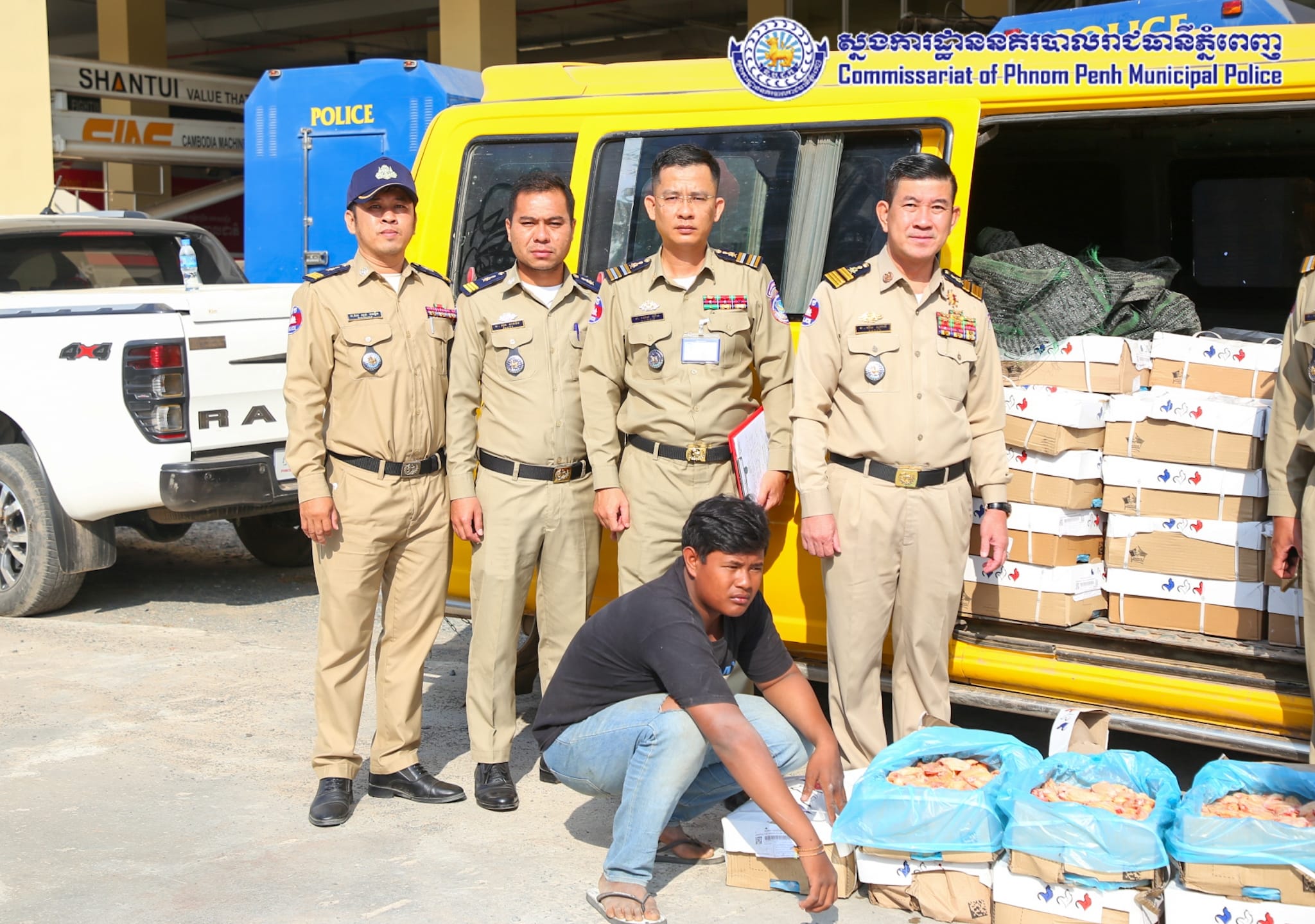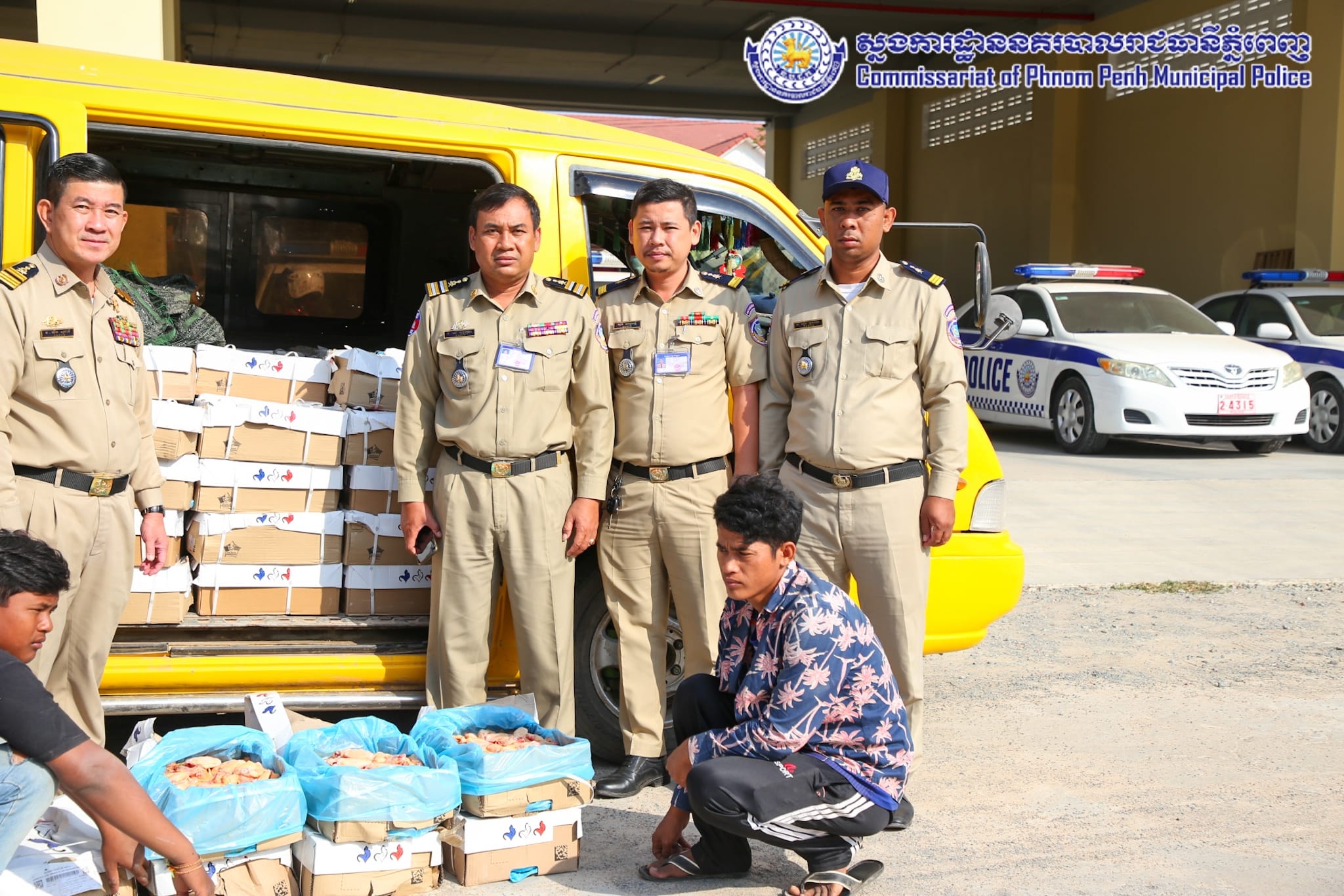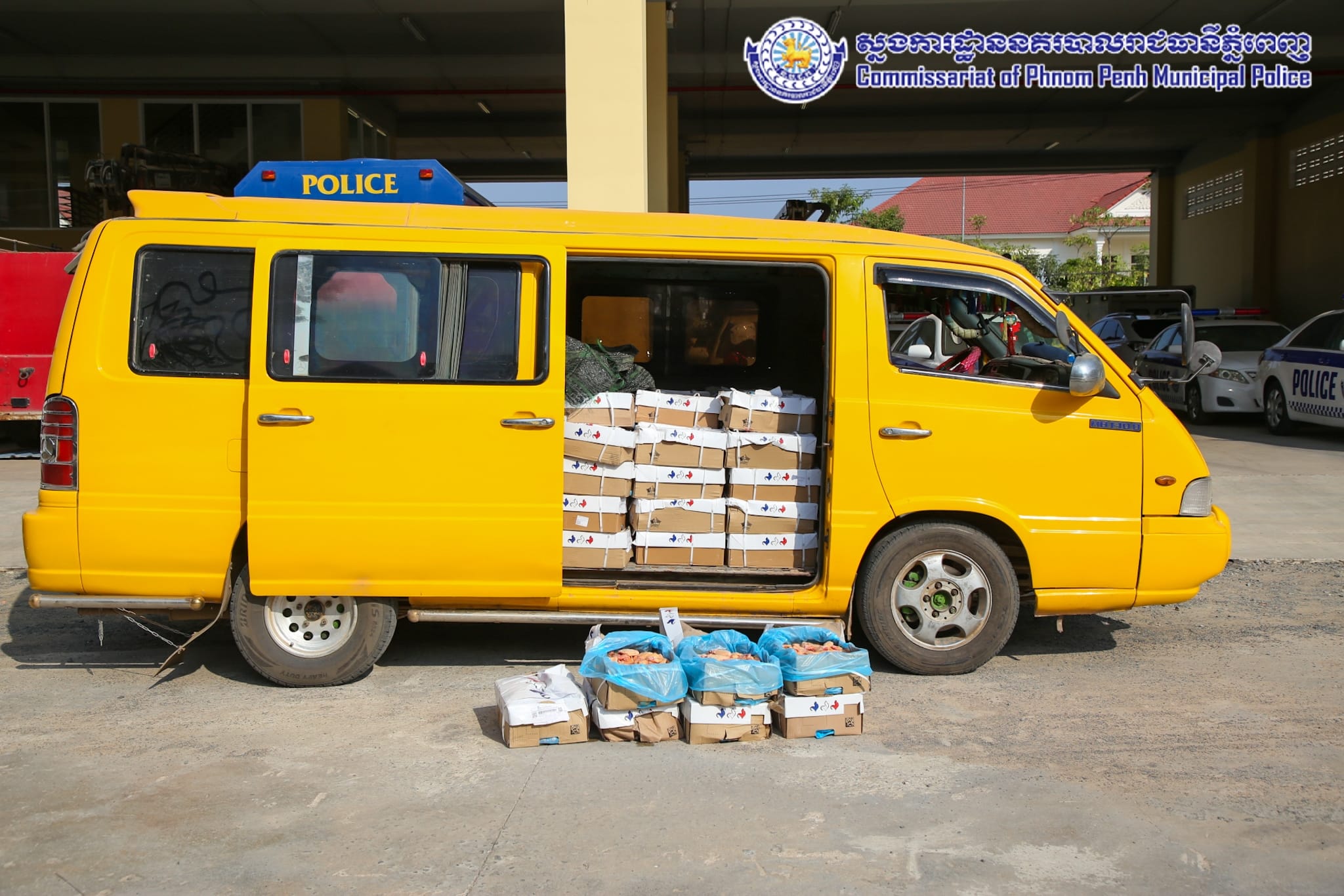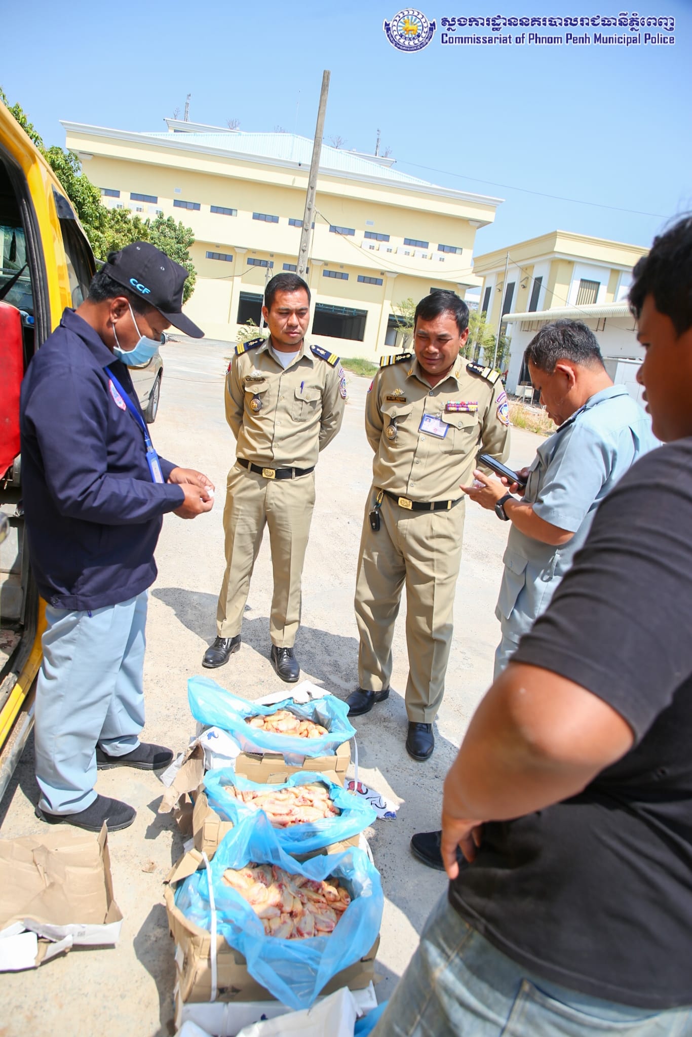 ដោយអនុវត្តតាមបទបញ្ជារបស់ឯកឧត្តម ឧត្តមសេនីយ៍ឯក ជួន ណារិន្ទ អគ្គស្នងការរង និងជាស្នងការនគរបាលរាជធានីភ្នំពេញ នៅថ្ងៃទី១៤ ខែកុម្ភៈ ឆ្នាំ២០២៤ កម្លាំងការិយាល័យនគរបាលប្រឆាំងបទល្មើសសេដ្ឋកិច្ច ដឹកនាំបង្ក្រាបដោយលោកឧត្តមសេនីយ៍ទោ ពិត បញ្ញា ស្នងការរង ទទួលផែនការងារនគរបាលប្រឆាំងបទល្មើសសេដ្ឋកិច្ច និងលោកឧត្តមសេនីយ៍ត្រី ជុំ ណារ័ត្ន អនុផែនការងារ និងលោកវរសេនីយ៍ឯក យឹម សុជាតិ នាយការិយាល័យនគរបាលប្រឆាំងបទល្មើសសេដ្ឋកិច្ច សហការជាមួយ ក.ប.ប. រាជធានីភ្នំពេញ បានធ្វើបង្ក្រាបស្លាបមាន់ ខូចគុណភាព ចំនួន២០០កេស ស្មើនឹង ២,០០០គីឡូក្រាម គ្មានឯកសារបញ្ជាក់ពីប្រភពច្បាស់លាល់ និងមិនអនុលោមភាពផ្នែកបទដ្ឋានព័ត៌មានលក្ខខ័ណ្ឌតម្រូវម្ហូបអាហារ ដែលធ្វើឱ្យប៉ះពាល់ដល់សុខភាពប្រជាពលរដ្ឋជាអ្នកប្រើប្រាស់។