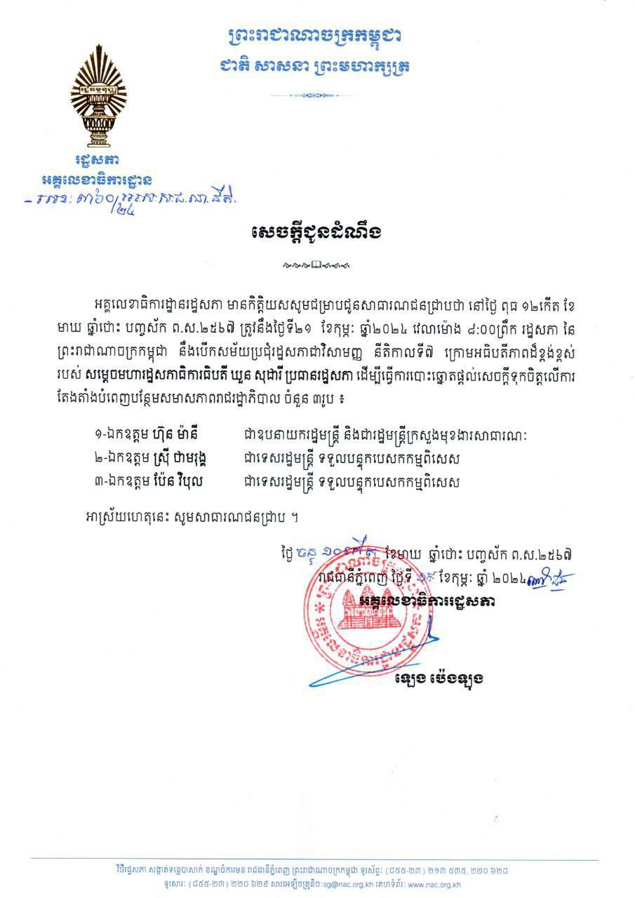 រាជធានីភ្នំពេញ៖ យោងតាមការចុះផ្សាយរបស់ ទូរទស្សន៍ជាតិកម្ពុជា ទទក បានឱ្យដឹងថា នៅព្រឹកថ្ងៃទី២១ ខែកុម្ភៈ ឆ្នាំ២០២៤ខាងមុខនេះ រដ្ឋសភា នៃព្រះរាជាណាចក្រកម្ពុជា នឹងបើកសម័យប្រជុំរដ្ឋសភាជាវិសាមញ្ញ នីតិកាលទី៧ ក្រោមអធិបតីភាពដ៏ខ្ពង់ខ្ពស់ របស់សម្ដេចមហារដ្ឋសភាធិការធិបតី ឃួន សុដារី ប្រធានរដ្ឋសភា ដើម្បីធ្វើការបោះឆ្នោតផ្តល់សេចក្តីទុកចិត្តលើការ តែងតាំងបំពេញបន្ថែមសមាសភាពរាជរដ្ឋាភិបាល ចំនួន ៣រូប។