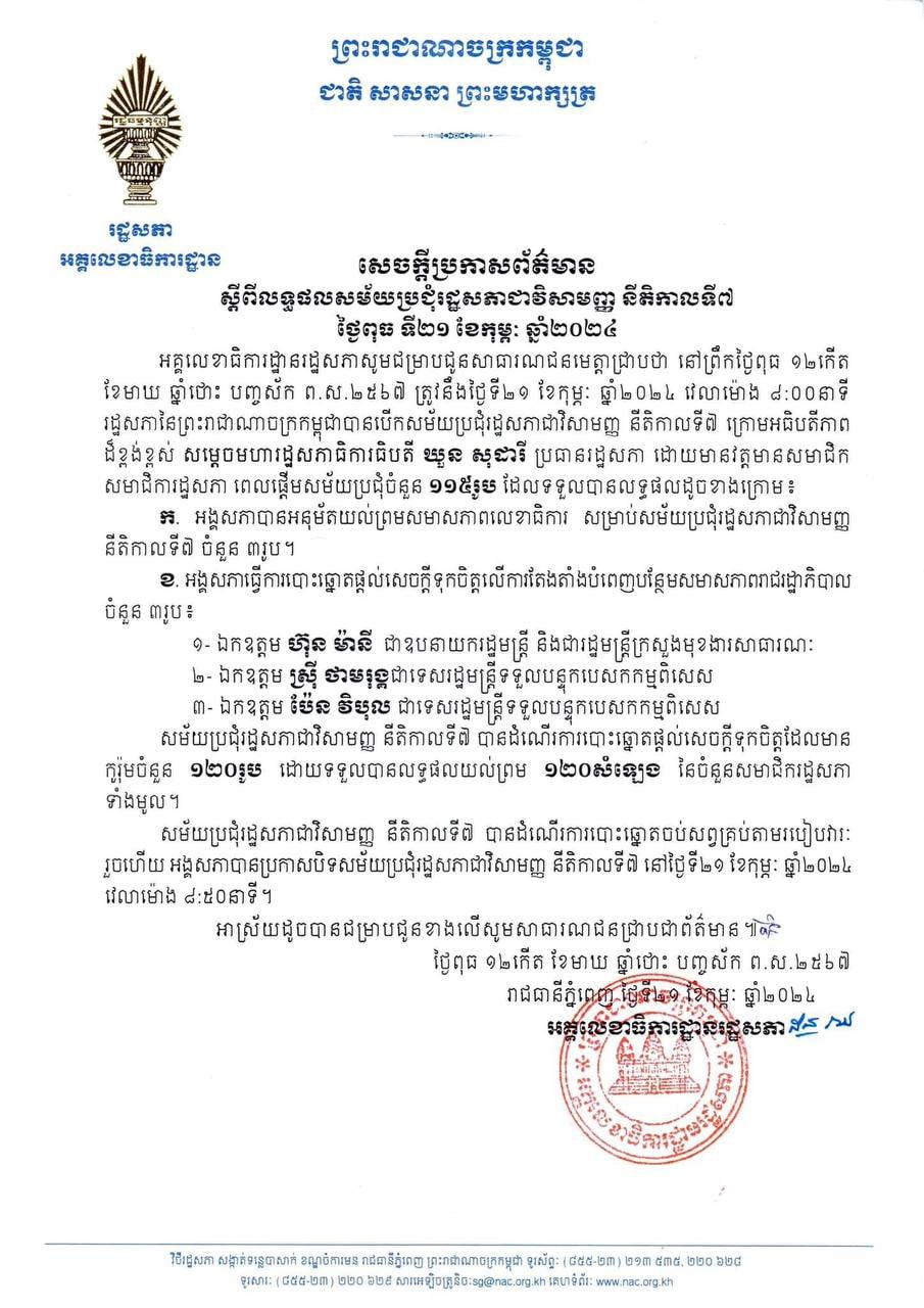 សម័យប្រជុំរដ្ឋសភាជាវិសាមញ្ញ នីតិកាលទី៧ បានដំណើរការបោះឆ្នោតចប់សព្វគ្រប់តាមរបៀបវារៈ រួចហើយ អង្គសភាបានប្រកាសបិទសម័យប្រជុំរដ្ឋសភាជាវិសាមញ្ញ នីតិកាលទី៧ នៅថ្ងៃទី២១ ខែកុម្ភៈ ឆ្នាំ២០២៤ វេលាម៉ោង ៨៖៥០នាទី។ អាស្រ័យដូចបានជម្រាបជូនខាងលើសូមសាធារណជនជ្រាបជាព័ត៌មាន ៕