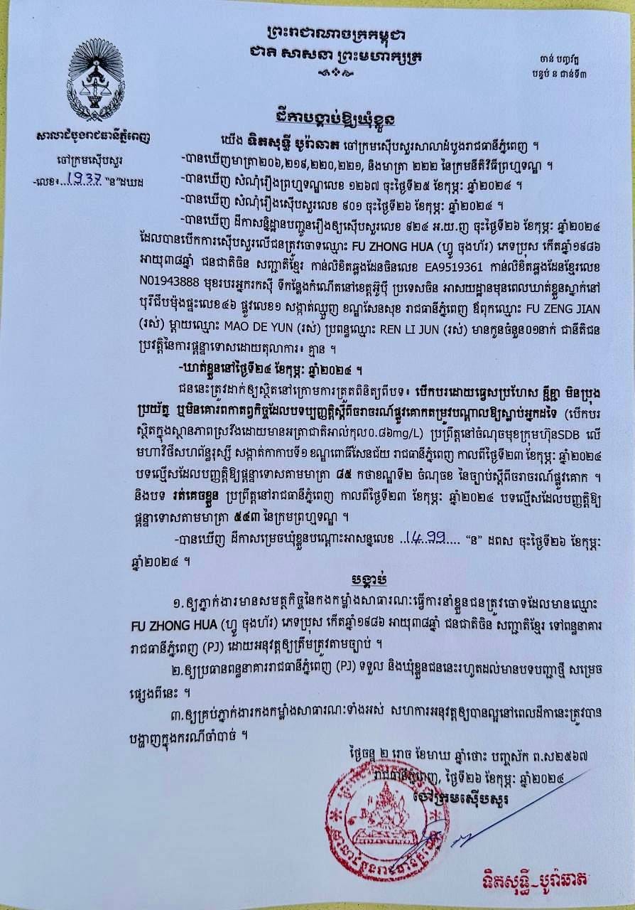 រាជធានីភ្នំពេញ៖ នៅថ្ងៃទី២៧ ខែកុម្ភៈ ឆ្នាំ២០២៤ យោងតាមការចុះផ្សាយរបស់ ស្នងការដ្ឋាននគរបាលរាជធានីភ្នំពេញ បានឱ្យដឹងថា ជនសង្ស័យឈ្មោះ FU ZHONG HUA ភេទប្រុស ដែលបើករថយន្ដ LUMBORGHINI ពណ៌ទឹកក្រូច ដែលបង្កគ្រោះថ្នាក់ចរាចរណ៍ នៅចំណុចមុខក្រុមហ៊ុន SDB មហាវិថីសហពន្ធ័រុស្សី ខណ្ឌពោធិ៍សែនជ័យ បណ្តាលឱ្យអ្នកបើកម៉ូតូ បាត់បង់ជីវិត ត្រូវបានតុលាការសម្រេចឃុំខ្លួននៅពន្ធនាគាររាជធានីភ្នំពេញ (PJ)។