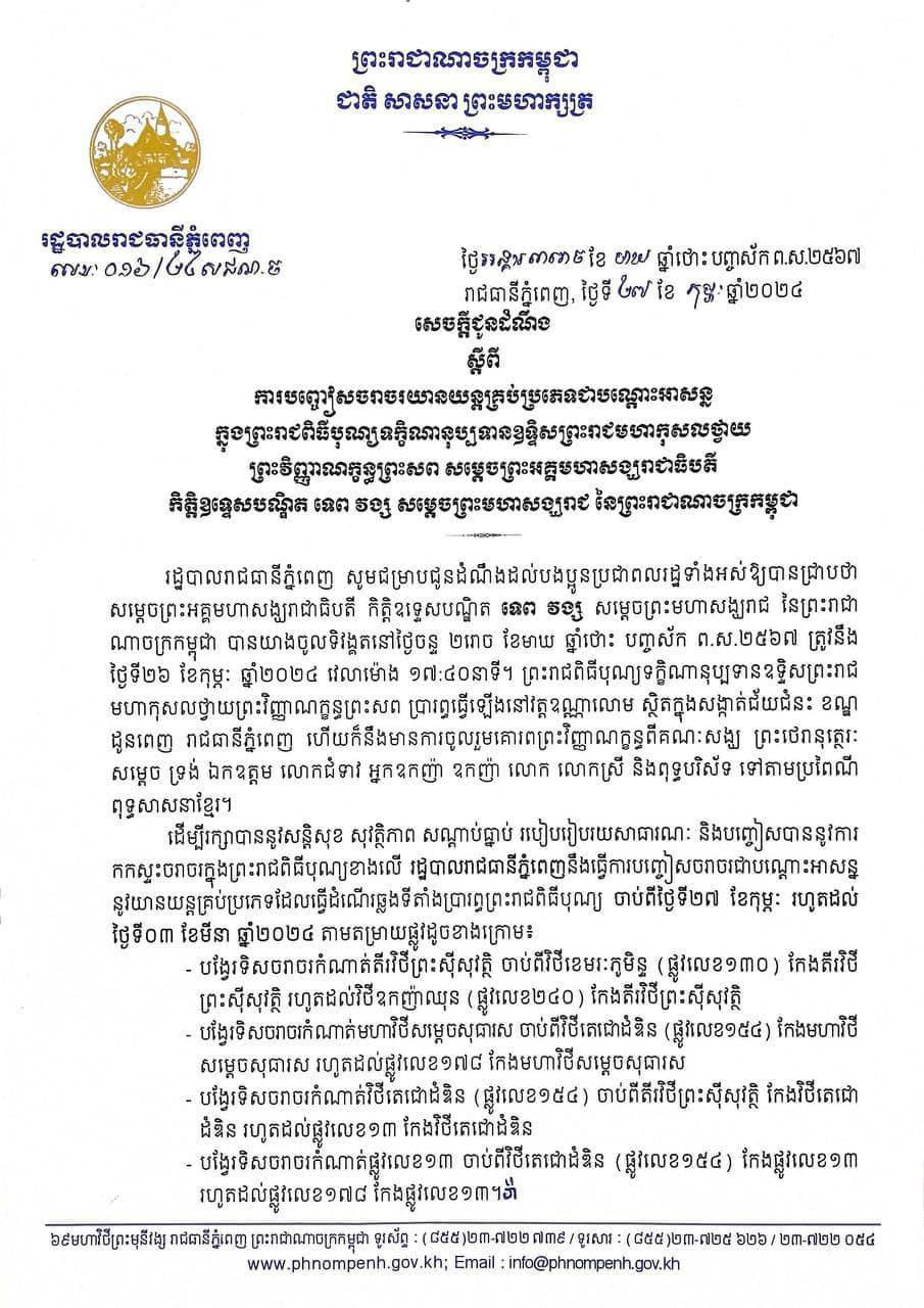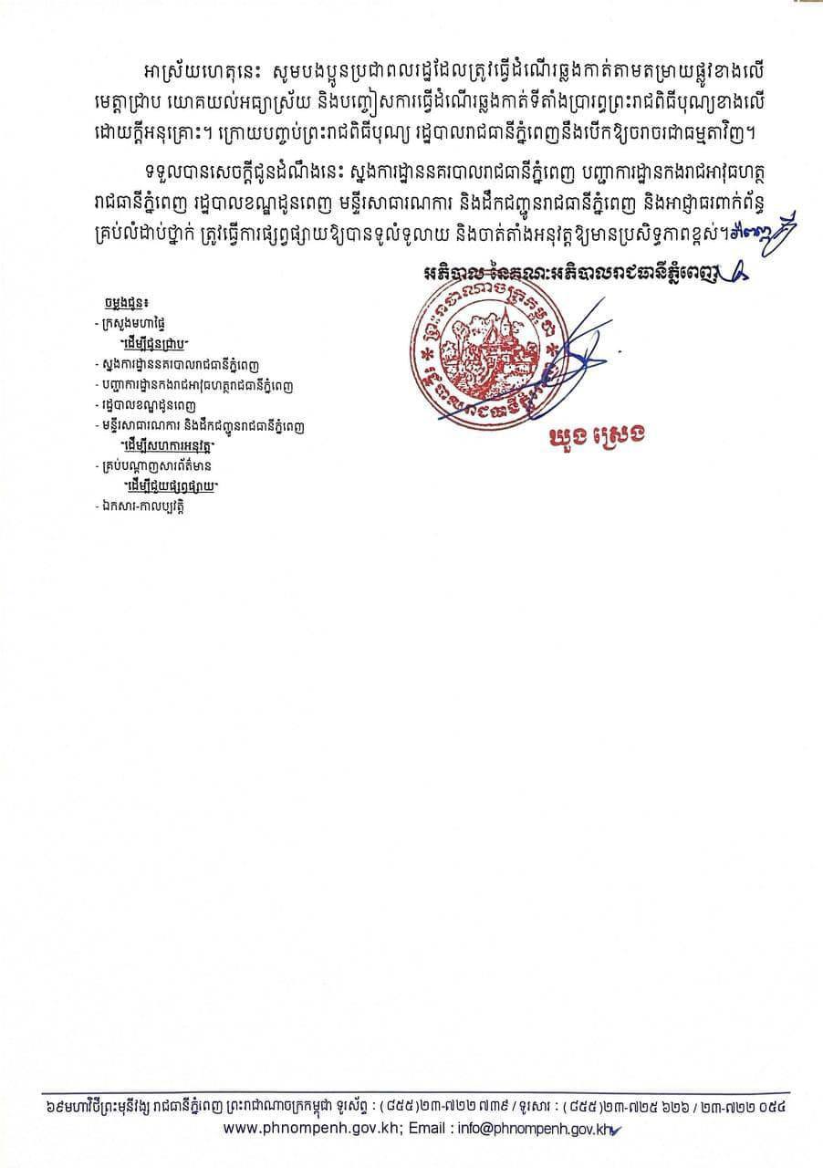 អាស្រ័យហេតុនេះ សូមបងប្អូនប្រជាពលរដ្ឋដែលត្រូវធ្វើដំណើរឆ្លងកាត់តាមតម្រាយផ្លូវខាងលើ មេត្តាជ្រាប យោគយល់អធ្យាស្រ័យ និង់បញ្ចៀសការធ្វើដំណើរឆ្លងកាត់ទីតាំងប្រារព្ធព្រះរាជពិធីបុណ្យខាងលើ ដោយក្ដីអនុគ្រោះ។ ក្រោយបញ្ចប់ព្រះរាជពិធីបុណ្យ រដ្ឋបាលរាជធានីភ្នំពេញនឹងបើកឱ្យចរាចរជាធម្មតាវិញ ៕