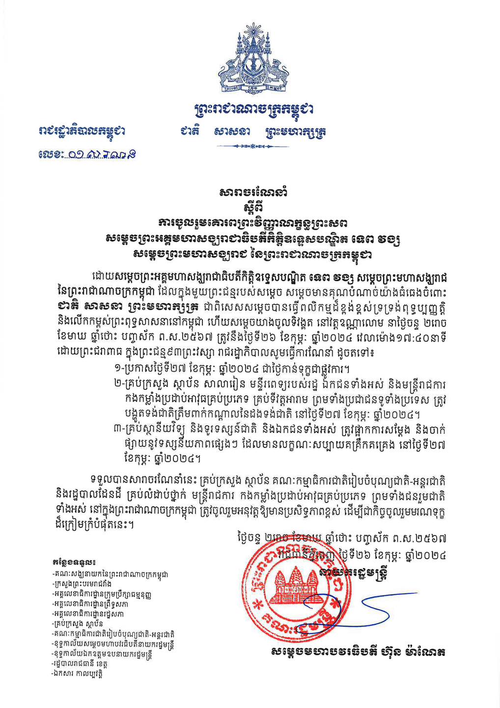 ដោយសម្តេចព្រះអគ្គមហាសង្ឃរាជាធិបតីកិត្តិឧទ្ទេសបណ្ឌិត ទេព វង្ស សម្តេចព្រះមហាសង្ឃរាជ នៃព្រះរាជាណាចក្រកម្ពុជា ដែលក្នុងមួយព្រះជន្មរបស់សម្តេច សម្ដេចមានគុណបំណាច់យ៉ាងធំធេងចំពោះ ជាតិ សាសនា ព្រះមហាក្សត្រ ជាពិសេសសម្តេចបានធ្វើពលិកម្មដ៏ខ្ពង់ខ្ពស់ទ្រទ្រង់ពុទ្ធប្បញ្ញត្តិ និងលើកកម្ពស់ព្រះពុទ្ធសាសនានៅកម្ពុជា ហើយសម្តេចយាងចូលទិវង្គត នៅវត្តឧណ្ណាលោម នាថ្ងៃចន្ទ ២រោច ខែមាឃ ឆ្នាំថោះ បញ្ចស័ក ព.ស.២៥៦៧ ត្រូវនឹងថ្ងៃទី២៦ ខែកុម្ភៈ ឆ្នាំ២០២៤ វេលាម៉ោង១៧:៤០នាទី ដោយព្រះជរាពាធ ក្នុងព្រះជន្ម៩៣ព្រះវស្សា រាជរដ្ឋាភិបាលសូមធ្វើការណែនាំ ដូចតទៅ៖