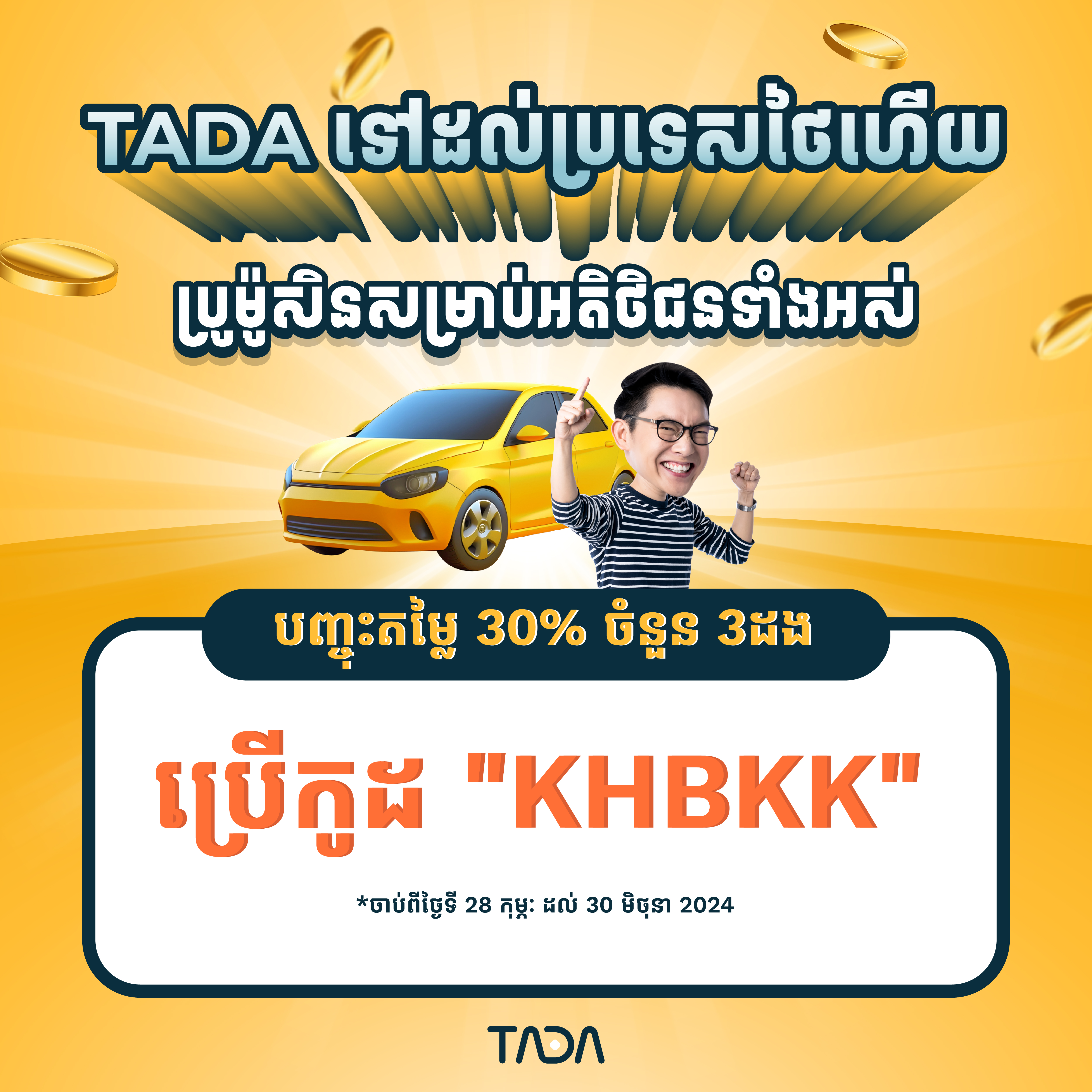 TADA ក៏នឹងមានប្រូម៉ូសិនពិសេសសម្រាប់អ្នកប្រើប្រាស់ប្រចាំប្រទេសកម្ពុជាទាំងអស់ ដើម្បីទទួលបានការបញ្ចុះតម្លៃរហូតដល់ 150បាត សម្រាប់ការជិះ TADA នៅប្រទេសថៃដោយប្រើប្រូម៉ូកូដ “KHBKK”។ អ្នកជិះអាចប្តូរយក 50បាត ពេលកក់ជិះម្ដងៗ សម្រាប់ការជិះ សរុបរហូតដល់ 3ដង។ ការផ្តល់ជូននេះ ចាប់ពីថ្ងៃទី 28 ខែកុម្ភៈ ឆ្នាំ 2024 រហូតដល់ថ្ងៃទី 30 ខែមិថុនា ឆ្នាំ 2024។