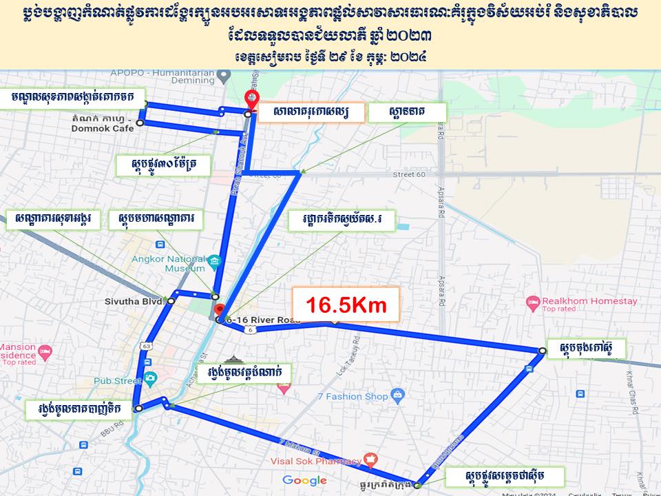 ជាមួយនឹងដង្ហែក្បួនអបអរសាទរជ័យលាភីខាងលើ ថ្នាក់ដឹកនាំរដ្ឋបាលខេត្ត រដ្ឋបាលក្រុង មន្ទីរ-អង្គភាពពាក់ព័ន្ធ សាមីអង្គភាពជ័យលាភី ស.ស.យ.កខេត្ត កាយរិទ្ធិ កាកបាទក្រហមផងដែរ នៅ ដោយចាប់ផ្ដើមចេញដំណើរពីសាលាគរុកោសល្យ និងវិក្រឹត្យការខេត្តសៀមរាប នៅតាមតម្រាយផ្លូវ ដូចមានក្នុងផែនទី។