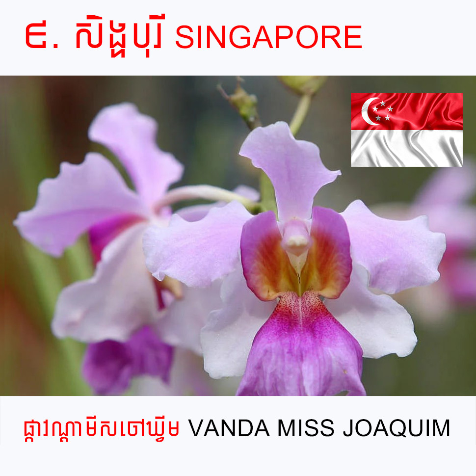 ៩. ផ្កាតំណាងជាតិរបស់ប្រទេសសិង្ហបុរីគឺ ផ្កាវ៉ាន់ដាមីសចៅឃ្វីម (Vanda Miss Joaquim) ផ្កាវ៉ាន់ដាមីសចៅឃ្វីម គឺជាផ្កាតំណាងជាតិរបស់ប្រជាជនប្រទេសសិង្ហបុរីទាំងមូល ចាប់តាំងពីថ្ងៃទី១៥ ខែមេសា ឆ្នាំ១៩៨១ តាមការមូលមតិគ្នារវាងប្រជាជន និងរដ្ឋាភិបាល អត្ថន័យរបស់ផ្កាវ៉ាន់ដាមីសចៅឃ្វីម គឺតំណាងឲ្យភាពរឹងមាំ ការតស៊ូ ក៏ដូចជា ភាពរីកចម្រើនរបស់ ប្រជាជនសិង្ហបុរី។
