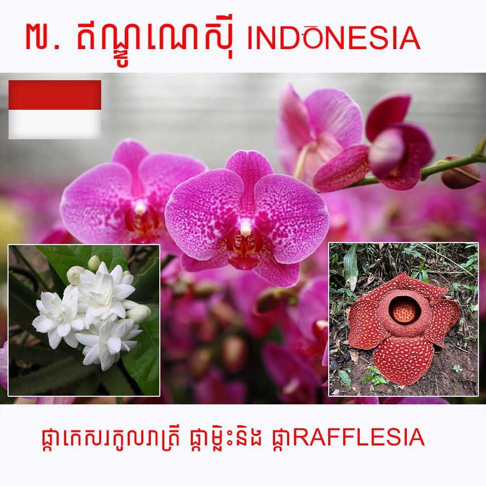 ៧. ផ្កាតំណាងជាតិរបស់ប្រទេសឥណ្ឌូណេស៊ី គឺមានបី ផ្កាកេសរកូលរាត្រី ផ្កាម្លិះ និងផ្កា Rafflesiaផ្កាកេសរកូលរាត្រី ផ្កាម្លិះនិងផ្កា Rafflesia ជាគឺជាផ្កាតំណាងជិតរបស់ឥណ្ឌូណេស៊ី ពិសេសផ្កា Rafflesia ជាប្រភេទផ្កា ដែលកម្របំផុតនៅលើពិភពលោកមានទំហំយ៉ាងធំសម្បើម តំណាងឲ្យដែនកោះស៊ូម៉ាត្រា និង បរណេអូនៃ ឥណ្ឌូណេស៊ី។
