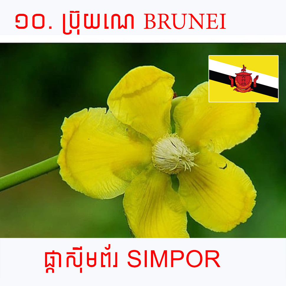 ១០. ផ្កាតំណាងជាតិរបស់ប្រទេសប្រ៊ុយណេគឺ ផ្កាស៊ីមព័រ Simporeផ្កាស៊ីមព័រ មានអត្ថន័យយ៉ាងជ្រាលជ្រៅ ចំពោះប្រជាជន នៃប្រទេសប្រ៊ុយណេ ពោលគឺវាតំណាងឲ្យ ភាពជោគជ័យ និងភាពរីកចម្រើនប្រជាជាតិ ប្រ៊ុយណេ ជាពិសេស រូបផ្កាស៊ីមព័រក៏ត្រូវបានរដ្ឋាភិបាល ដាក់បញ្ចូលក្នុងក្រដាសប្រាក់ ១ ដុល្លារប្រ៊ុយណេដែរ។