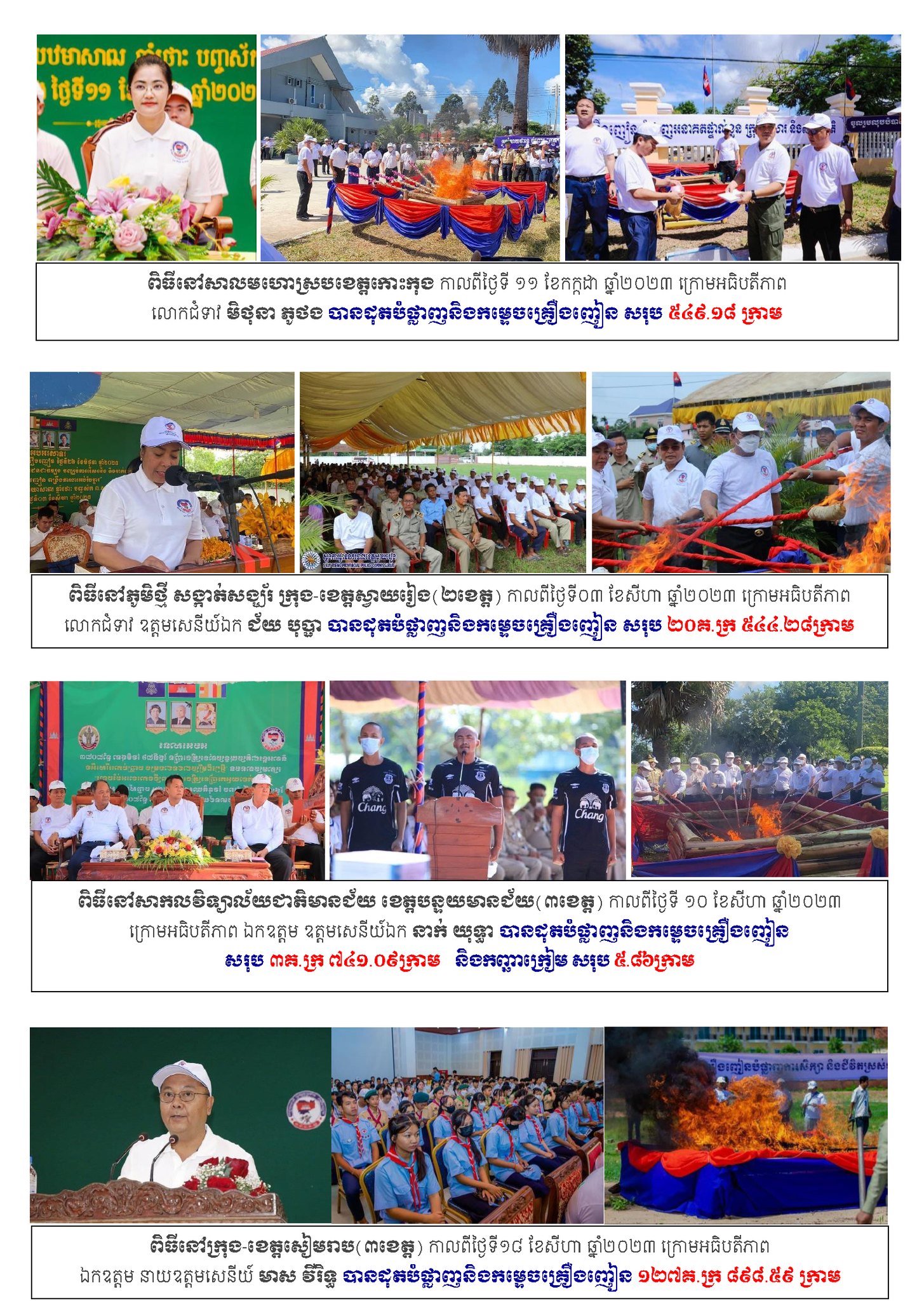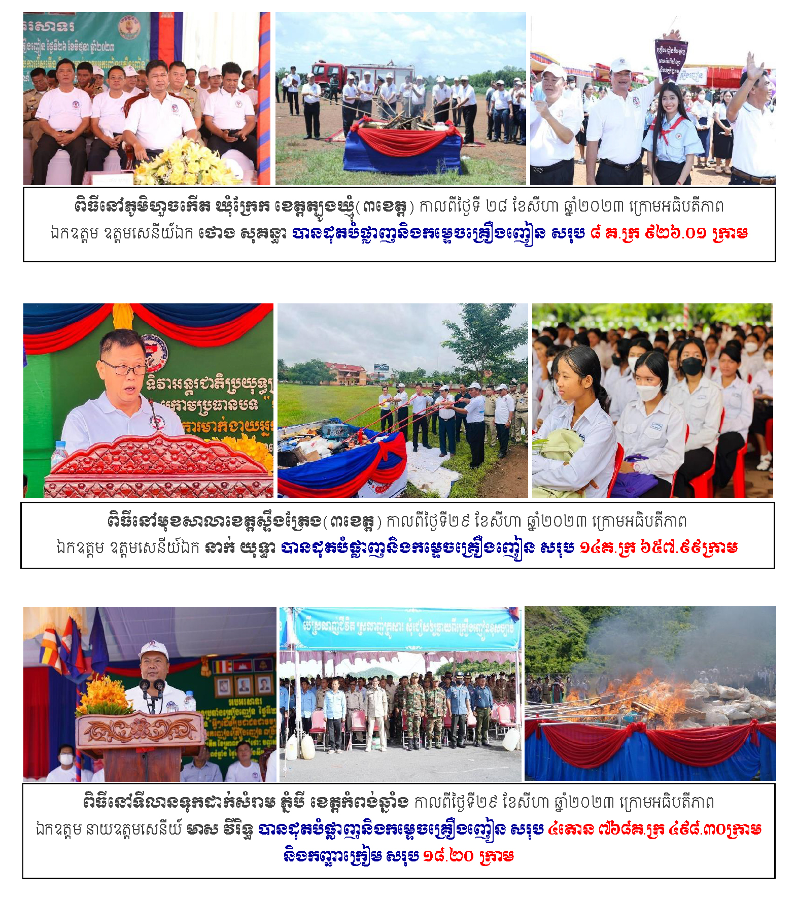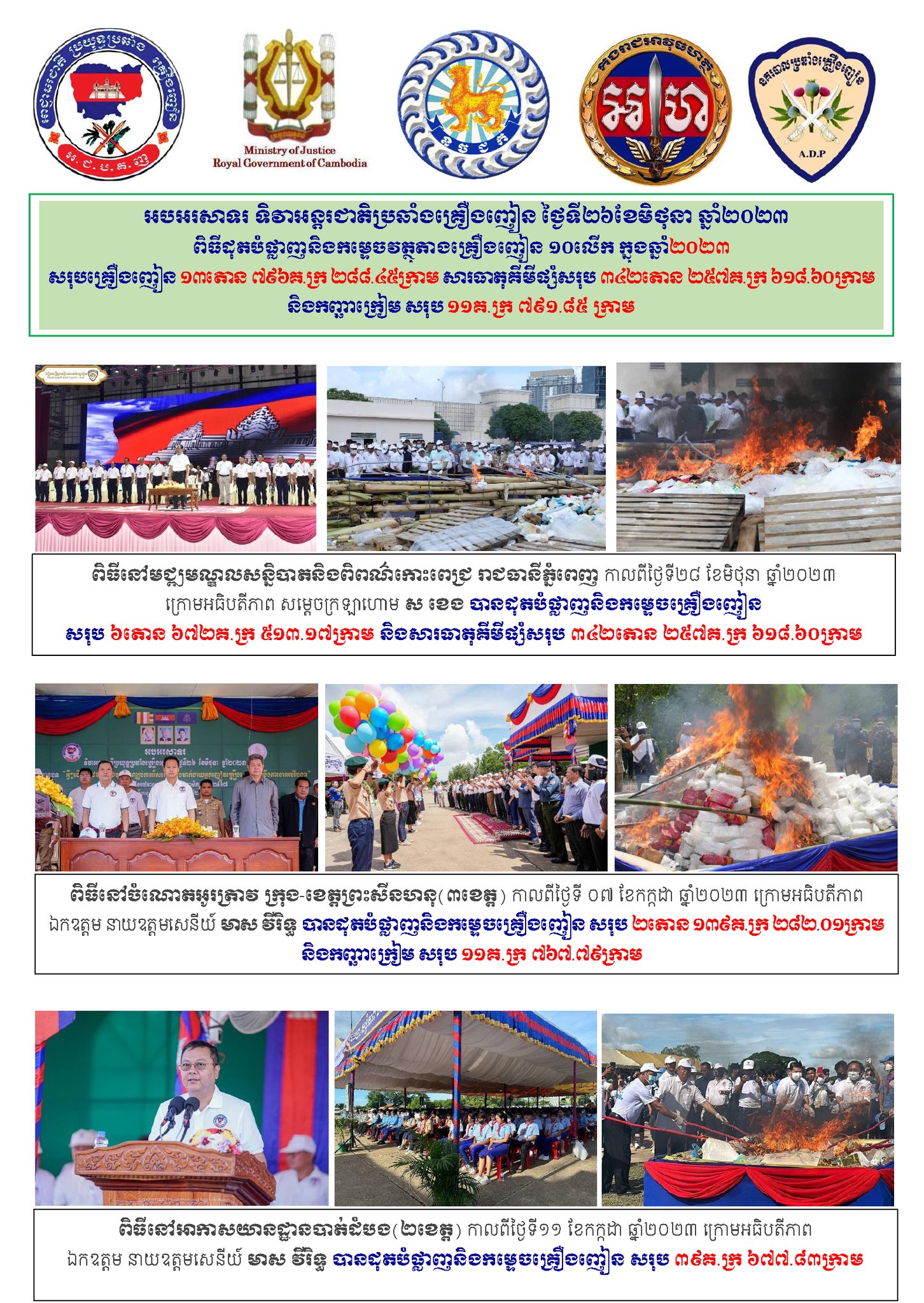 ជាស្តែងនៅឆ្នាំ២០២៣កន្លងទៅនេះ ក្នុងឱកាសអបអរសាទរ ទិវាអន្តរជាតិប្រឆាំងគ្រឿងញៀន ថ្ងៃទី២៦ខែមិថុនា មានការរៀបចំពិធីដុតបំផ្លាញ និងកម្ទេចវត្ថុតាងគ្រឿងញៀន ១០លើក សរុបគ្រឿងញៀន ១៣តោន ៧៩៦គីឡូក្រាម ២៨៨.៤៥ក្រាម សារធាតុគីមីផ្សំសរុប ៣៤២តោន ២៥៧គីឡូក្រាម ៦១៨.៦០ក្រាម និងកញ្ឆាក្រៀម សរុប ១១គីឡូក្រាម ៧៩១.៨៥ ក្រាម។