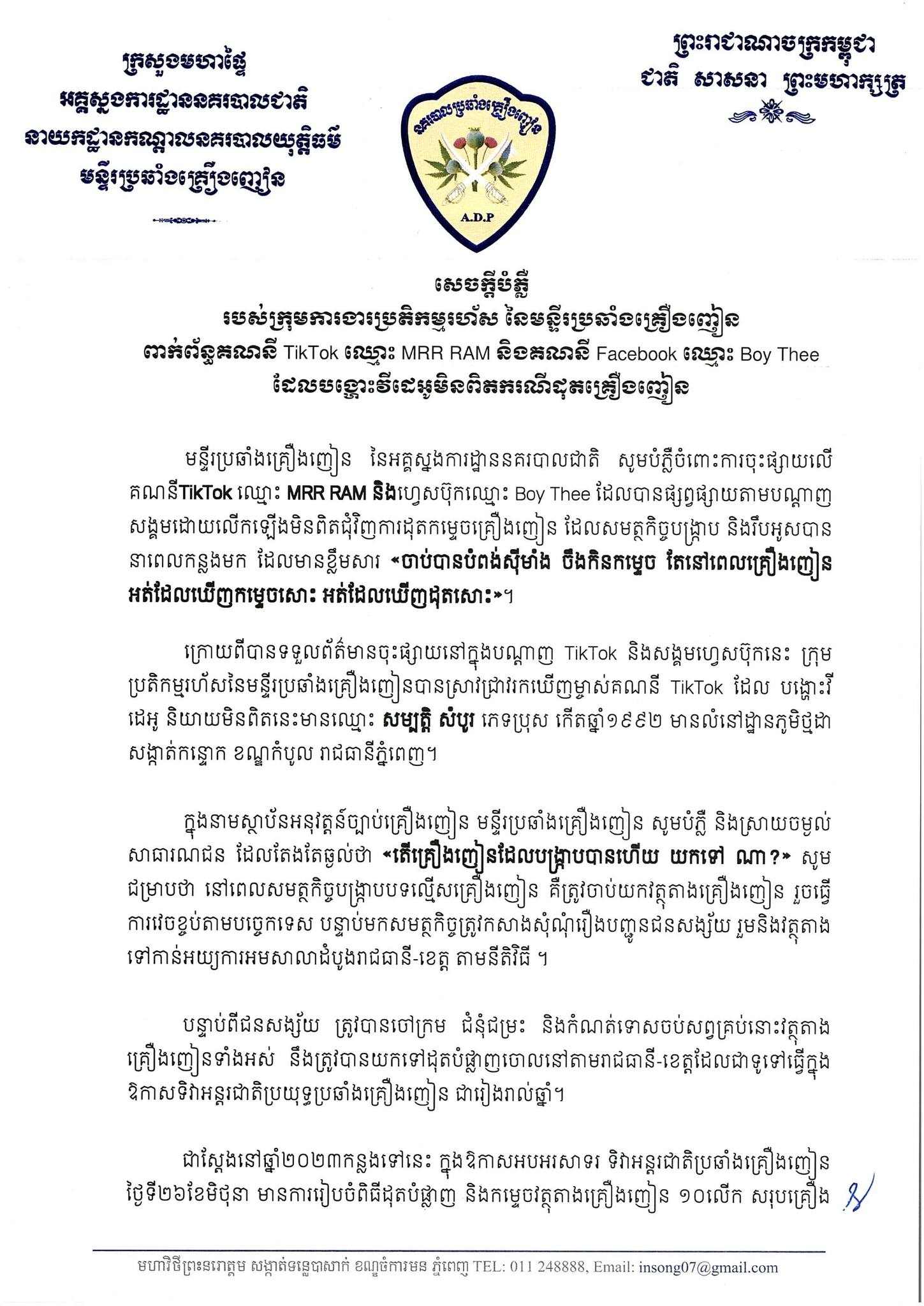 មន្ទីរប្រឆាំងគ្រឿងញៀន សូមបំភ្លឺចំពោះការចុះផ្សាយលើគណនីTikTok ឈ្មោះ MRR RAM និងហ្វេសប៊ុកឈ្មោះ Boy Thee ដែលបានផ្សព្វផ្សាយ តាមបណ្តាញសង្គម ដោយលើកឡើងមិនពិត ជុំវិញការដុតកម្ទេចគ្រឿងញៀន ដែលសមត្ថកិច្ចបង្ក្រាប និងរឹបអូសបាន នាពេលកន្លងមក ដែលមានខ្លឹមសារ «ចាប់បានបំពង់ស៊ីមាំង ចឹងកិនកម្ទេច តែនៅពេលគ្រឿងញៀន អត់ដែលឃើញកម្ទេចសោះ អត់ដែលឃើញដុតសោះ»។
