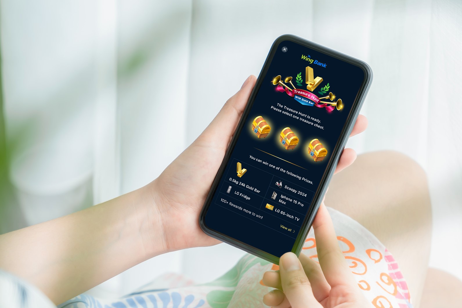 ដើម្បីលើកទឹកចិត្តទៅដល់អ្នកប្រើប្រាស់ទទួលយកបទពិសោធន៍កាន់តែសំបូរបែបបន្ថែមទៀតនោះ ធនាគារ វីង បានផ្តល់បន្ថែមនូវកម្មវិធីបើកកេសយករង្វាន់ ដែលផ្តល់ជូនយ៉ាងពិសេសសម្រាប់អ្នកប្រើប្រាស់អេប Wing Bank។ កម្មវិធីនេះដំណើរការរហូតដល់ថ្ងៃទី៣១ ខែកក្កដា ឆ្នាំ២០២៤ ដែលអនុញ្ញាតទៅដល់អ្នកចូលរួមមាន ឱកាសឈ្នះរង្វាន់ប្រចាំថ្ងៃ ប្រចាំខែ ដែលរួមាន៖ ឱកាសឈ្នះរង្វាន់ចាប់ពី ២០ Wingcoin រហូតដល់ ១០.០០០ Wingcoin, ទូរស័ព្ទ iPhone 15 Pro Max ទូរទស្សន៍ LG 65 អ៊ីញ ទូទឹកកកម៉ាក LG។ សម្រាប់រង្វាន់ប្រចាំត្រីមាសវិញរួមមាន ម៉ូតូ Scoopy ស៊េរីថ្មីឆ្នាំ២០២៤ និងរង្វាន់ធំជាមាសសុទ្ធទម្ងន់ 0.5kg។