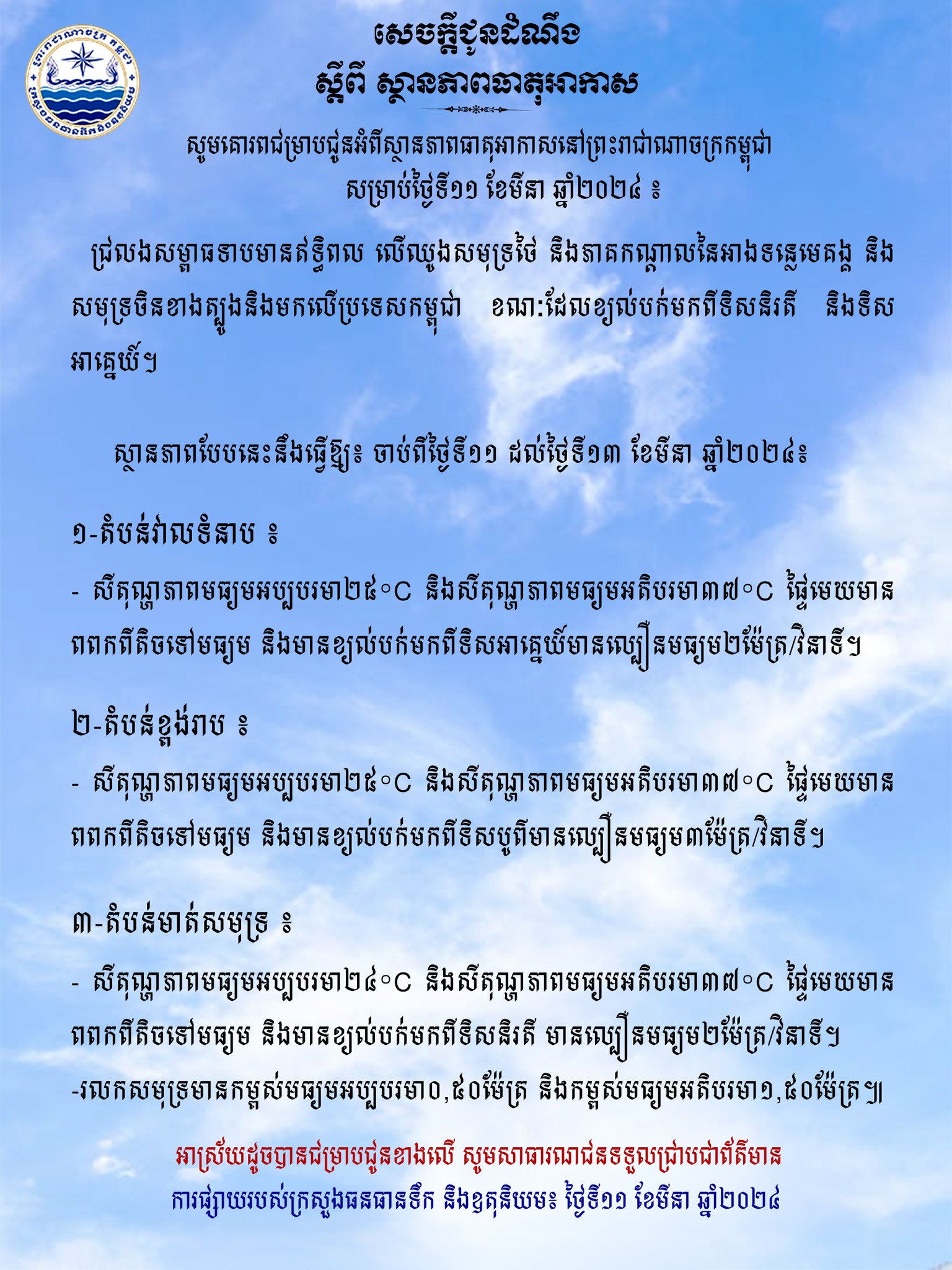 រាជធានីភ្នំពេញ៖ យោងតាមការចុះផ្សាយរបស់ ក្រសួងធនធានទឹក និងឧតុនិយម បានចេញសេចក្ដីជូនដំណឹង អំពីស្ថានភាពធាតុអាកាសនៅព្រះរាជាណាចក្រកម្ពុជាសម្រាប់ថ្ងៃទី១១ ខែមីនា ឆ្នាំ២០២៤។