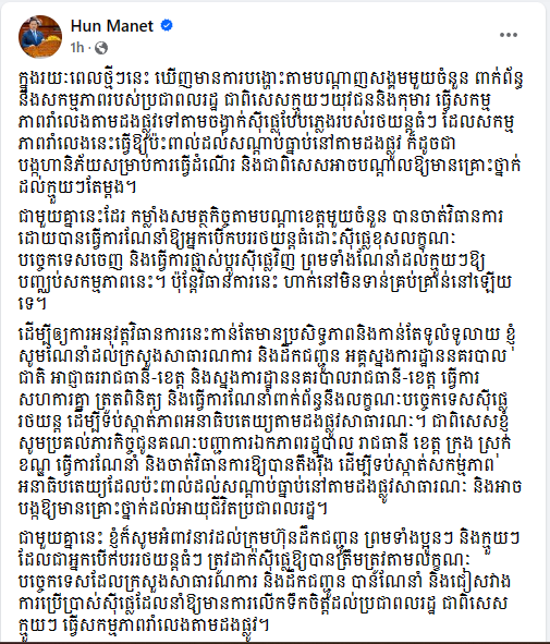 តាមរយៈខ្លឹមសារបង្ហោះរបស់ សម្តេចមហាបវរធិបតី ហ៊ុន ម៉ាណែត បានបញ្ជាក់យ៉ាងដូច្នេះថា៖ « ក្នុងរយៈពេលថ្មីៗនេះ ឃើញមានការបង្ហោះតាមបណ្តាញសង្គមមួយចំនួន ពាក់ព័ន្ធនឹងសកម្មភាពរបស់ប្រជាពលរដ្ឋ ជាពិសេសក្មួយៗយុវជននិងកុមារ ធ្វើសកម្មភាពរាំលេងតាមដងផ្លូវទៅតាមចង្វាក់ស៊ីផ្លេបែបភ្លេងរបស់រថយន្តធំៗ ដែលសកម្មភាពរាំលេងនេះធ្វើឱ្យប៉ះពាល់ដល់សណ្តាប់ធ្នាប់នៅតាមដងផ្លូវ ក៏ដូចជាបង្កហានិភ័យសម្រាប់ការធ្វើដំណើរ និងជាពិសេសអាចបណ្តាលឱ្យមានគ្រោះថ្នាក់ដល់ក្មួយៗតែម្តង។»