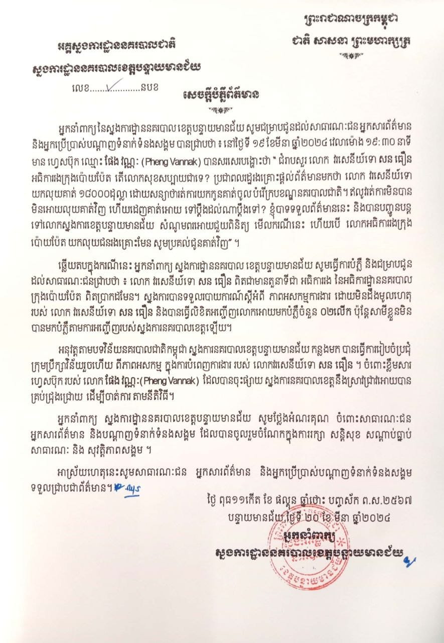 ខេត្តបន្ទាយមានជ័យ៖ នៅថ្ងៃទី២០ ខែមីនា ឆ្នាំ២០២៤ យោងតាមការចុះផ្សាយរបស់ ស្នងការដ្ឋាននគរបាលខេត្តបន្ទាយមានជ័យ បានចេញសេចក្ដីបំភ្លឺរបស់ អ្នកនាំពាក្យនៃស្នងការដ្ឋាននគរបាលខេត្តបន្ទាយមានជ័យ ជូនដល់សាធារណៈជនអ្នកសារព័ត៌មាន និងអ្នកប្រើប្រាស់បណ្តាញទំនាក់ទំនងសង្គម បានជ្រាបថា៖