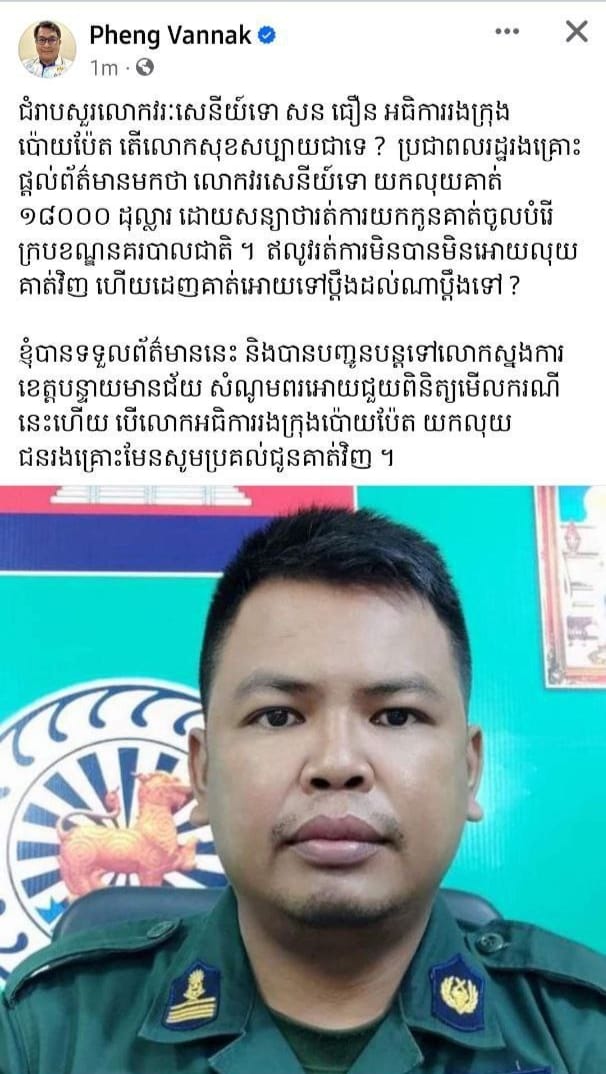 នៅថ្ងៃទី១៩ ខែមីនា ឆ្នាំ២០២៤ វេលាម៉ោង ១៩:៣០ នាទី មានហ្វេសប៊ុកឈ្មោះ ផែង វណ្ណៈ (Pheng Vannak) បានសរសេរបង្ហោះថា «ជំរាបសួរ លោកវរសេនីយ៍ទោ សន ធឿន អធិការរងក្រុងប៉ោយប៉ែត តើលោកសុខសប្បាយជាទេ? ប្រជាពលរដ្ឋរងគ្រោះផ្តល់ព័ត៌មានមកថា លោកវរសេនីយ៍ទោ យកលុយគាត់ ១៨០០០ដុល្លារ ដោយសន្យាថារត់ការយកកូនគាត់ចូលបំរើក្របខណ្ឌនគរបាលជាតិ។ ឥលូវរត់ការមិនបាន មិនអោយលុយគាត់វិញហើយ ដេញគាត់អោយទៅប្តឹងដល់ណាប្តឹងទៅ? ខ្ញុំបាទទទួលព័ត៌មាននេះ និងបានបញ្ជូនបន្ត ទៅលោកស្នងការខេត្តបន្ទាយមានជ័យ សំណូមពរអោយជួយពិនិត្យ មើលករណីនេះ ហើយបើលោកអធិការរងក្រុងប៉ោយប៉ែត យកលុយជនរងគ្រោះមែន សូមប្រគល់ជូនគាត់វិញ»។