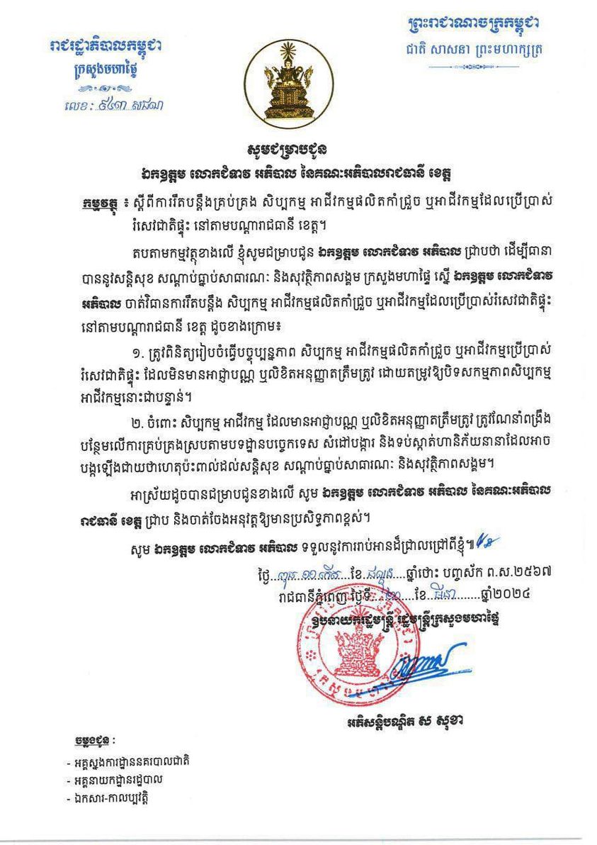 ដើម្បីធានាបាននូវសន្តិសុខ សណ្តាប់ធ្នាប់សាធារណៈ និងសុវត្ថិភាពសង្គម ក្រសួងមហាផ្ទៃ ស្នើ ឯកឧត្តម លោកជំទាវ អភិបាល ចាត់វិធានការរឹតបន្តឹង សិប្បកម្ម អាជីវកម្មផលិតកាំជ្រួច ឬអាជីវកម្មដែលប្រើប្រាស់រំសេវជាតិផ្ទុះ នៅតាមបណ្តារាជធានី ខេត្ត ដូចខាងក្រោម៖