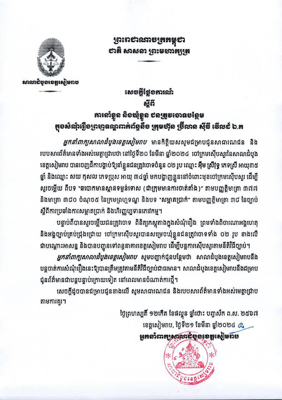 អ្នកនាំពាក្យសាលាដំបូងខេត្តសៀមរាប នៅថ្ងៃទី២០ ខែមីនា ឆ្នាំ២០២៤ ចៅក្រមស៊ើបសួរនៃសាលាដំបូងខេត្តសៀមរាប បានចេញដីកាបង្គាប់ឱ្យនាំខ្លួនជនត្រូវចោទចំនួន ០២ រូប រួមមាន៖ ឈ្មោះ អ៉ឹម ស្រីវុទ្ធ ភេទស្រី អាយុ៣៥ ឆ្នាំ និងឈ្មោះ សយ កុសល ភេទប្រុស អាយុ ៣៤ឆ្នាំ មកបង្ហាញខ្លួននៅចំពោះមុខចៅក្រមស៊ើបសួរ ដើម្បីសួរចម្លើយ ពីបទ «ឆបោកមានស្ថានទម្ងន់ទោស (ជាក្រុមមានការចាត់តាំង)» តាមបញ្ញត្តិមាត្រា ៣៧៧ និងមាត្រា ៣៨០ ចំណុច៥ នៃក្រមព្រហ្មទណ្ឌ និងបទ «សម្អាតប្រាក់» តាមបញ្ញត្តិមាត្រា ៣៨ នៃច្បាប់ ស្តីពីការប្រឆាំងការសម្អាតប្រាក់ និងហិរញ្ញប្បទានភេរវកម្ម។​