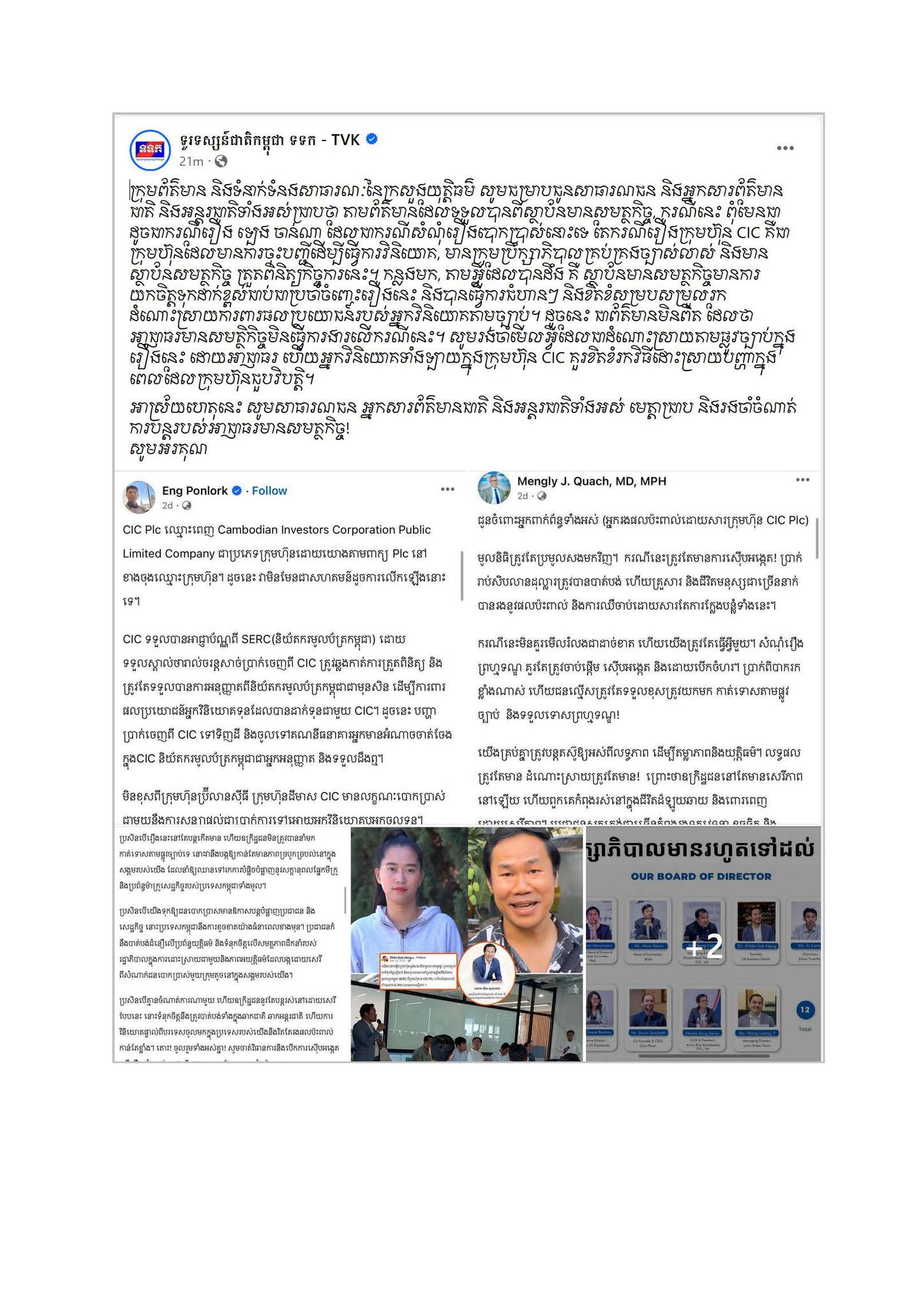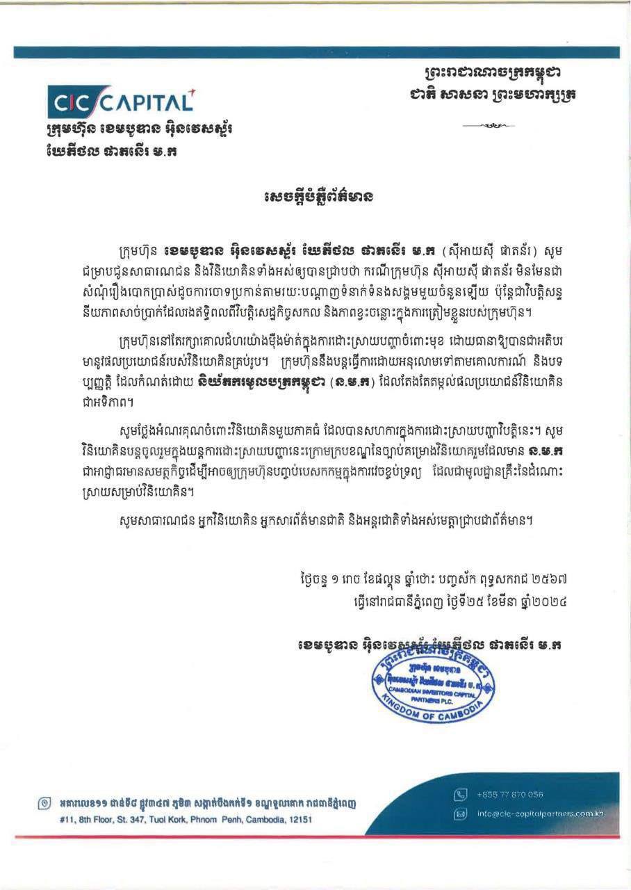 ក្រុមហ៊ុន CIC ចេញសេចក្ដីប្រកាសព័ត៌មាន អំពីការរក្សាគោលជំហរយ៉ាងម៉ឺងម៉ាត់ ក្នុងការដោះស្រាយបញ្ហាចំពោះមុខ ដោយធានាឱ្យបាននូវផលប្រយោជន៍របស់វិនិយោគិន