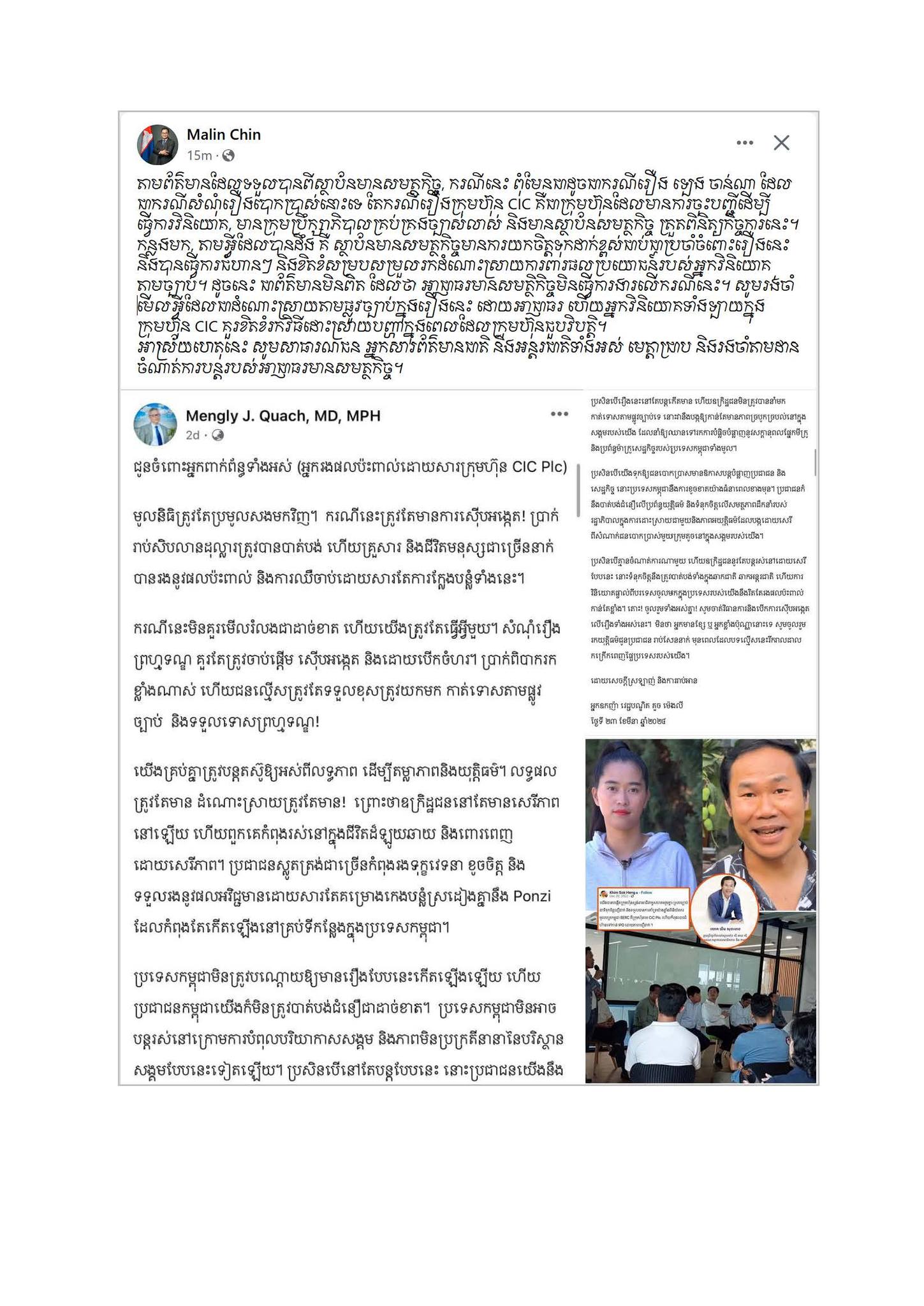 រាជធានីភ្នំពេញ៖ នៅថ្ងៃទី២៥ ខែមីនា ឆ្នាំ២០២៤ យោងតាមសេចក្ដីបំភ្លឺព័ត៌មាន របស់ក្រុមហ៊ុន CIC CAPITAL សូមជម្រាបជូនសាធារណជន និងវិនិយោគិនទាំងអស់ មេត្តាជ្រាបថា ករណីក្រុមហ៊ុន ស៊ីអាយស៊ី ផាតន័រ មិនមែនជាសំណុំរឿងបោកប្រាស់ ដូចការចោទប្រកាន់តាមរយៈបណ្តាញទំនាក់ទំនងសង្គមមួយចំនួនឡើយ ប៉ុន្តែជាវិបត្តិសន្ទនីយភាពសាច់ប្រាក់ ដែលរងឥទ្ធិពលពីវិបត្តិសេដ្ឋកិច្ចសកល និងភាពខ្វះចន្លោះក្នុងការត្រៀមខ្លួនរបស់ក្រុមហ៊ុន។