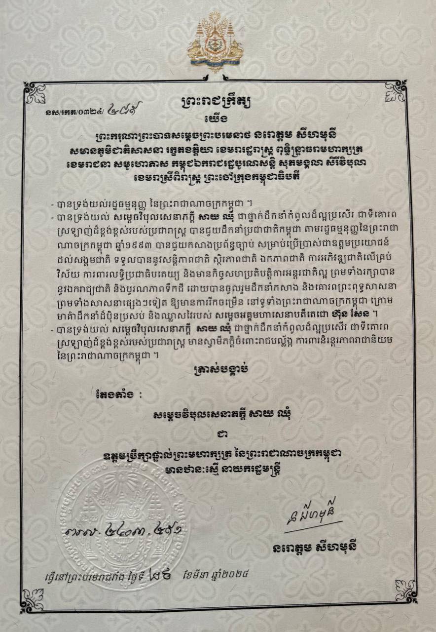 ព្រះមហាក្សត្រ ចេញព្រះរាជក្រឹត្យ តែងតាំងសម្តេចវិបុលសេនាភក្តី សាយ ឈុំ ជា ឧត្តមប្រឹក្សាផ្ទាល់ព្រះមហាក្សត្រនៃកម្ពុជា មានឋានៈស្មើនាយករដ្ឋមន្ត្រី