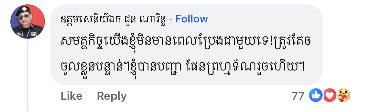 ក្នុងនោះ ឯកឧត្តម ឧត្តមសេនីយ៍ឯក ជួន ណារិន្ទ បានបញ្ជាក់ថា «សមត្ថកិច្ចយើងខ្ញុំមិនមានពេលPrank ជាមួយទេ។ ខ្ញុំបញ្ជា ផែនព្រហ្មទ័ណ្ឌរួចហើយ» ៕