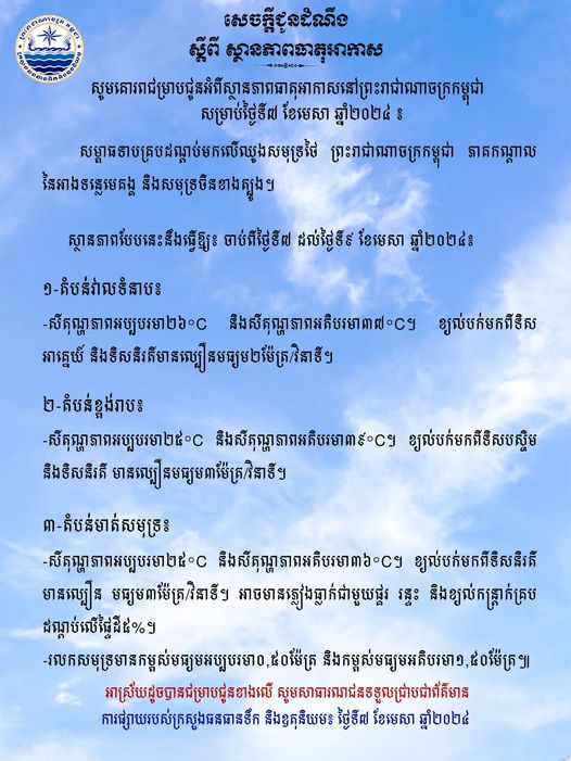 (ភ្នំពេញ)៖ នៅថ្ងៃទី៧ ខែមេសា ឆ្នាំ២០២៤ ក្រសួងធនធានទឹក និងឧតុនិយម បានចេញសេចក្តីជូនដំណឹង ពីស្ថានភាពធាតុអាកាសនៅកម្ពុជា។