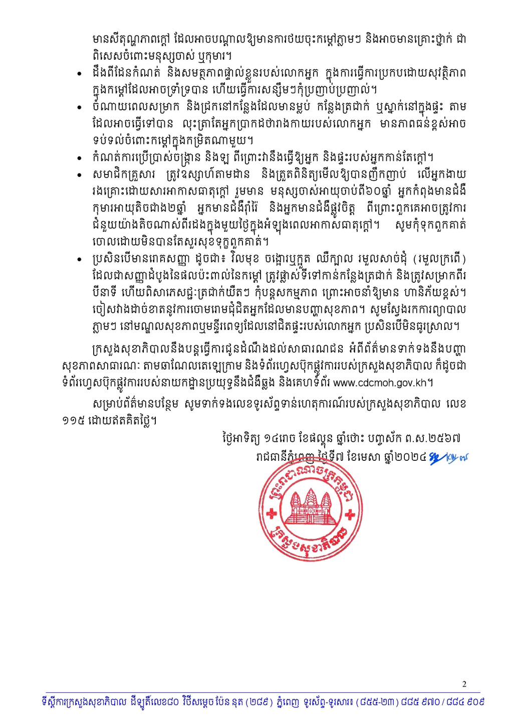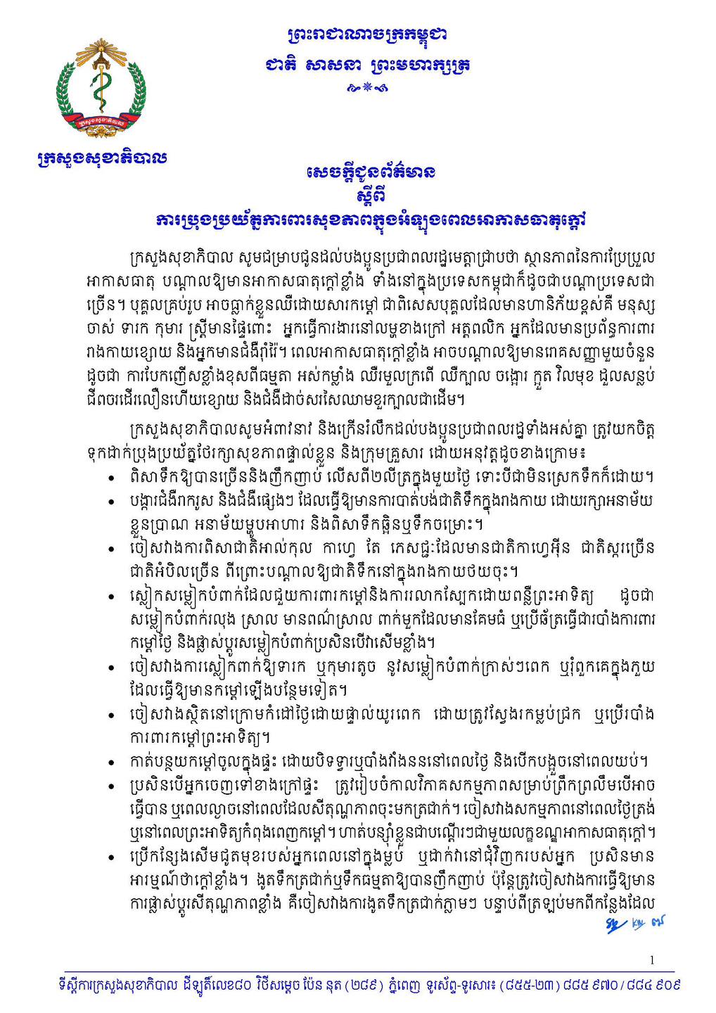 ក្រសួងសុខាភិបាល សូមជម្រាបជូនដល់ប្រជាពលរដ្ឋឱ្យបានជ្រាបថា ស្ថានភាពនៃការប្រែប្រួលអាកាសធាតុ បណ្ដាលឱ្យមានអាកាសធាតុក្ដៅខ្លាំង ទាំងនៅក្នុងប្រទេសកម្ពុជាក៏ដូចជាបណ្ដាប្រទេសជាច្រើន។ បុគ្គលគ្រប់រូបអាចធ្លាក់ខ្លួនឈឺដោយសារកម្ដៅ ជាពិសេសេបុគ្គលដែលមានហានិភ័យខ្ពស់គឺ មនុស្សចាស់ ទារក កុមារ ស្ដ្រីមានផ្ទៃពោះ អ្នកធ្វើការងារនៅលម្ហខាងក្រៅ អត្តពលិក អ្នកដែលមានប្រព័ន្ធការពាររាងកាយខ្សោយ និងអ្នកមានជំងឺរ៉ាំរ៉ៃ។ អាកាសធាតុក្ដៅខ្លាំង អាចបណ្ដាលឱ្យមានរោគសញ្ញាមួយចំនួនដូចជា ការបែកញើសខ្លាំងខុសពីធម្មតា អស់កម្លាំង ឈឺរមួលក្រពើ ឈឺក្បាល ចង្អោរ ក្អួត វិលមុខ ដួលសន្លប់ ជីពចរដើរលឿនហើយខ្សោយ និងជំងឺដាច់សរសៃឈាមខួរក្បាលជាដើម។