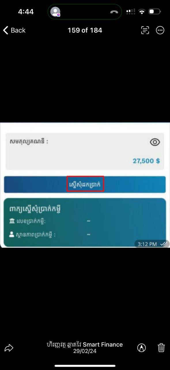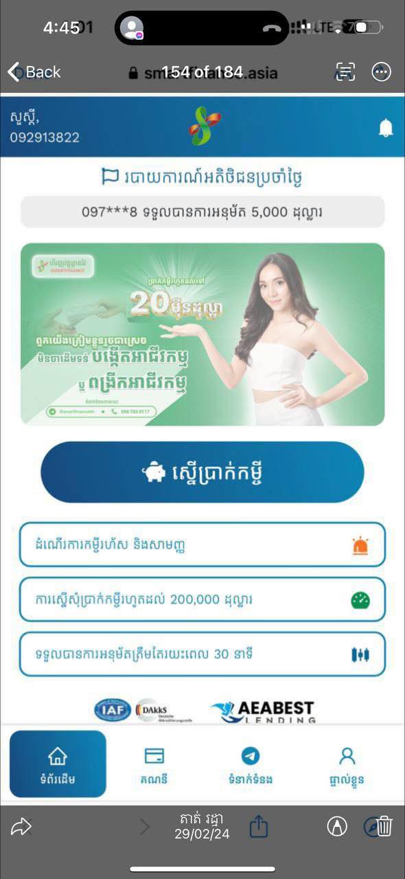 តាមបណ្តឹងជនរងគ្រោះ ឈ្មោះ ត.ដ បានឲ្យដឹងថា ខ្លួនបានឃើញផេកហ្វេសប៊ុកកម្ចីអនឡាញ ឈ្មោះហិរញ្ញវត្ថុឆ្លាតវៃ Smart Finance និងបានឆាតសួរនាំ រឿងកម្ចីប្រាក់។ បន្ទាប់មកគេបានសុំគណនីតេលេក្រាមជនរងគ្រោះដើម្បីទំនាក់ទំនង។ ជនរងគ្រោះក៏បានឲ្យទៅគេនិងបានឆាតទំនាក់ទំនងគ្នាតាមគណនីតេលេក្រាមរបស់ខ្លួននិងតេលេក្រាមជនសង្ស័យឈ្មោះហិរញ្ញវត្ថុឆ្លាតវៃ Smart Finance និងបានសួរនាំពីកម្ចីប្រាក់ ហើយខាងក្រុមហ៊ុនបានសួរនាំពីចំណូលរបស់ជនរងគ្រោះ និងបានឲ្យថតរូបអត្តសញ្ញាណប័ណ្ណសញ្ជាតិខ្មែរនិងបានឲ្យថតរូបងាកឆ្វេង ងាកស្តាំ និងបានប្រាប់ជនរងគ្រោះថាអាចខ្ចីបាន១៣០០០$ តែគេសុំ៣១០$មុនជាថ្លៃរៀបចំឯកសារ ។ជនរងគ្រោះក៏យល់ព្រម និងបានវេរប្រាក់តាមរយៈQR code ។