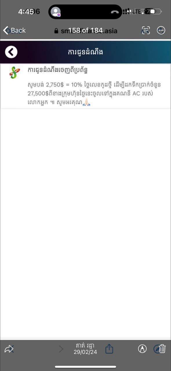 ក្រោយមកខាងក្រុមហ៊ុនបានប្រាប់មកជនរងគ្រោះ ថាខុសនេះខុសនោះ និងលោងលោមឲ្យជនរងគ្រោះវេរលុយទៅឲ្យគេ រហូតដល់១០លើក សរុបទឹកប្រាក់១៤៦៥២$ ក្រោយវេររួចទើបដឹងថាត្រូវចាញ់បោកគេ។ បច្ចុប្បន្នជនសង្ស័យ ត្រូវបានឃាត់ខ្លួន និងកសាងសំណុំរឿងបញ្ជូនទៅតុលាការចាត់ការតាមនីតិវិធី ៕