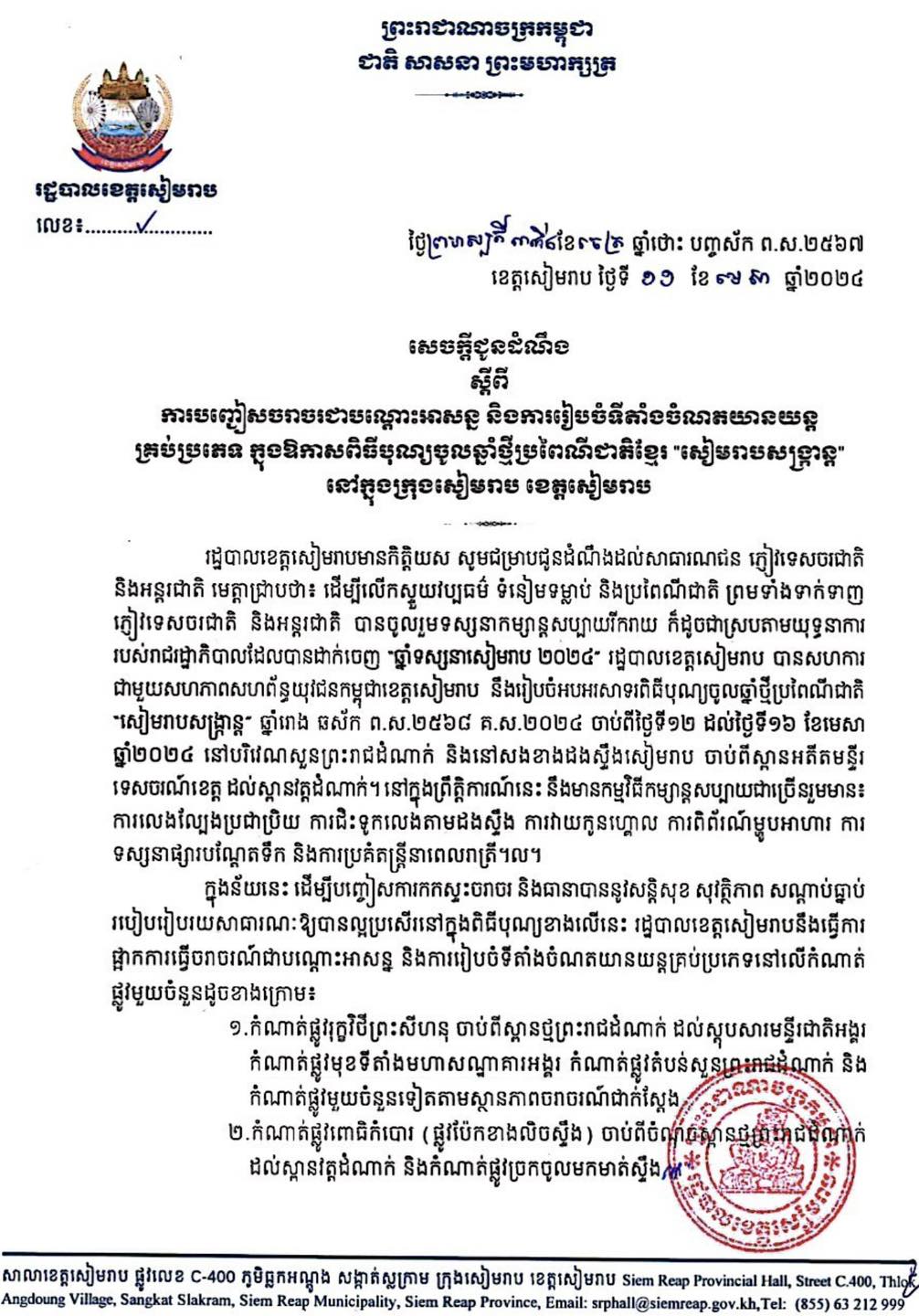 ខេត្តសៀមរាប៖ យោងតាមការចុះផ្សាយរបស់ រដ្ឋបាលខេត្តសៀមរាប បានចេញសេចក្តីជូនដំណឹង ស្តីពីការបញ្ចៀសចរាចរជាបណ្តោះអាសន្ន និងការរៀបចំទីតាំងចំណតយានយន្ត គ្រប់ប្រភេទ ក្នុងឱកាសពិធីបុណ្យចូលឆ្នាំថ្មីប្រពៃណីជាតិខ្មែរ “សៀមរាបសង្ក្រាន្ត” នៅក្នុងក្រុងសៀមរាប ខេត្តសៀមរាប ចាប់ពីថ្ងៃទី១២ ដល់ថ្ងៃទី១៦ ខែមេសា ឆ្នាំ២០២៤ នៅបរិវេណសួនព្រះរាជដំណាក់ និងនៅសងខាងដងស្ទឹងសៀមរាប ចាប់ពីស្ពានអតីតមន្ទីរ ទេសចរណ៍ខេត្ត ដល់ស្ពានវត្តដំណាក់។