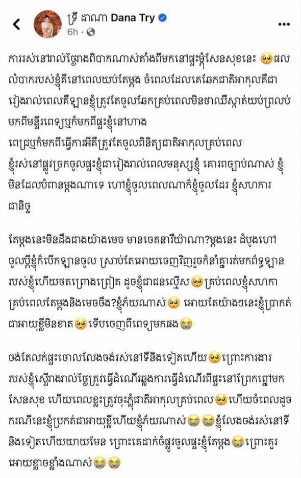 (ភ្នំពេញ)៖ នៅថ្ងៃទី២៨ ខែមេសា ឆ្នាំ២០២៤ ផេកផ្លូវការរបស់ ស្នងការដ្ឋាននគរបាលរាជធានីភ្នំពេញ បានចេញស្រាយបំភ្លឺឆ្លើយតបទៅហ្នឹងការបង្ហោះសាររបស់ លោកស្រី ទ្រី ដាណា ជុំវិញករណី “កម្លាំងសមត្ថកិច្ចអនុវត្តត្រួតពិនិត្យជាតិស្រវឹងនៅខណ្ឌសែនសុខ រៀងរាល់ពេលគឺឡានខ្ញុំត្រូវតែចូលឆែកគ្រប់ពេលមិនថាឈឺស្កាត់យប់ព្រលប់មកពីមន្ទីរពេទ្យឬក៏មកពីផ្ទះខ្ញុំនៅហាងពេជ្រឬក៏មកពីធ្វើការអីគឺត្រូវតែចូលពិនិត្យជាតិអាកុលគ្រប់ពេល”។