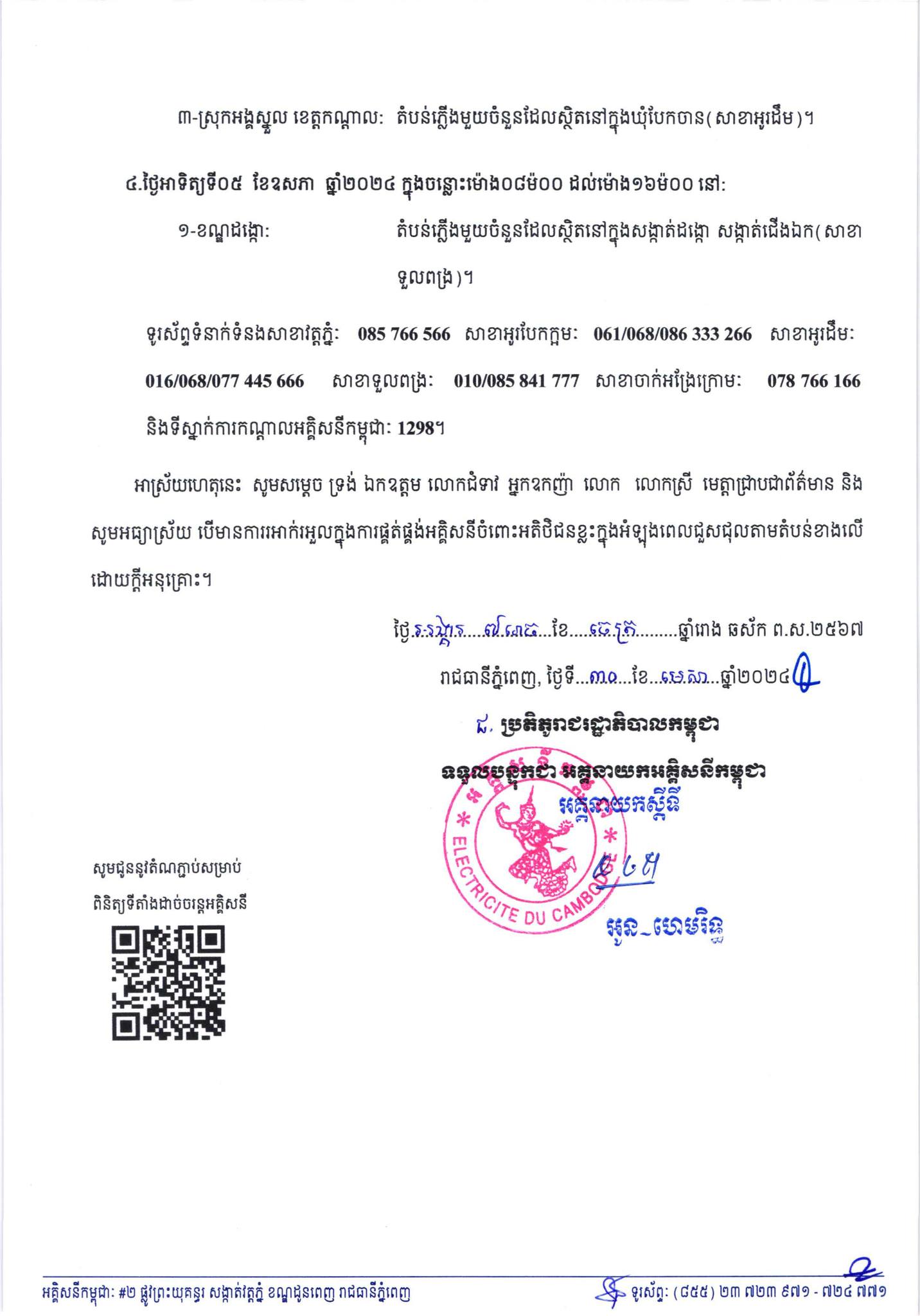 អគ្គិសនីកម្ពុជា កាលពីថ្ងៃទី៣០ ខែមេសា ឆ្នាំ២០២៤ ម្សិលមិញនេះ បានចេញសេចក្ដីជូនដំណឹង ស្ដីពីការរអាក់រអួលក្នុងការផ្គត់ផ្គង់អគ្គិសនីនៅក្នុងបណ្ដាខណ្ឌមួយចំនួននៅរាជធានីភ្នំពេញ និងស្រុកអង្គស្នួលខេត្តកណ្ដាល ចាប់ពីថ្ងៃទី០២ ខែឧសភា រហូតដល់ថ្ងៃទី០៥ ខែឧសភា ឆ្នាំ២០២៤។