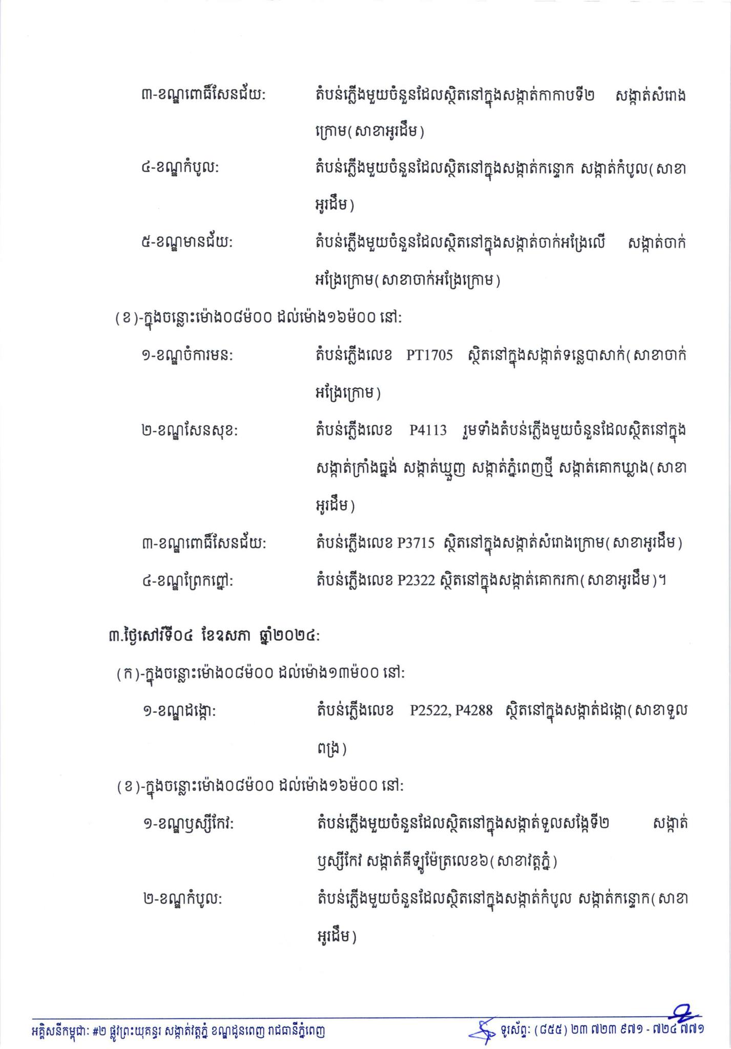 ជូនដំណឹង! ចាប់ពីស្អែកនេះ ដល់ថ្ងៃទី០៥ ខែឧសភា ខណ្ឌចំនួន ១០ នៅក្នុងក្រុងភ្នំពេញ និងស្រុក ១នៅខេត្តកណ្ដាល នឹងជួបបញ្ហារអាក់រអួលភ្លើង