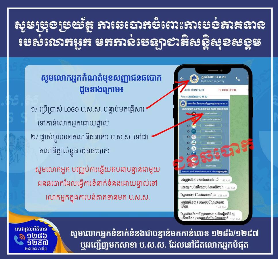 បេឡាជាតិសន្តិសុខសង្គម ជូនដំណឹងឱ្យមានការប្រុងប្រយ័ត្ន ក្រោយមានករណីឆបោកពីក្រុមជនអនាមិកទៅលើសមាជិក ប.ស.ស. ដោយធ្វើជាផ្ញើសារឱ្យបង់ភាគទានទៅគណនីធនាគារក្រុមនោះដោយផ្ទាល់