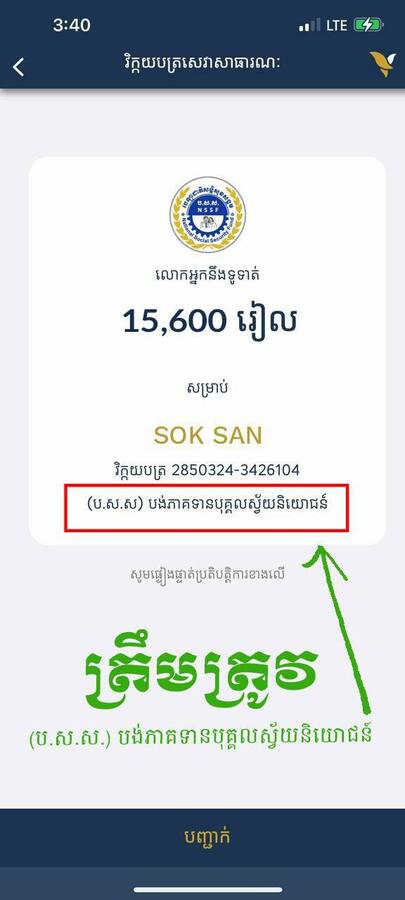 សូមបញ្ជាក់ថា សម្រាប់បងប្អូនសមាជិក ប.ស.ស. ជាបុគ្គលស្វ័យនិយោជន៍ រាល់ពេលបង់ភាគទានមក ប.ស.ស. ត្រូវរកមើលពាក្យ “ប.ស.ស. បង់ភាគទានស្វ័យនិយោជន៍” ឬជាភាសាអង់គ្លេស “NSSF Self Employed” ហើយប្រសិនបើពេលចុចបង់ភាគទាន តែមិនមានឃើញឈ្មោះដូចខាងលើទេ គឺមិនមែនជាគណនីរបស់ ប.ស.ស. ឡើយ ដូច្នេះ សូមកុំចុចបង់ ព្រោះជាការឆបោករបស់ក្រុមជនអនាមិក។