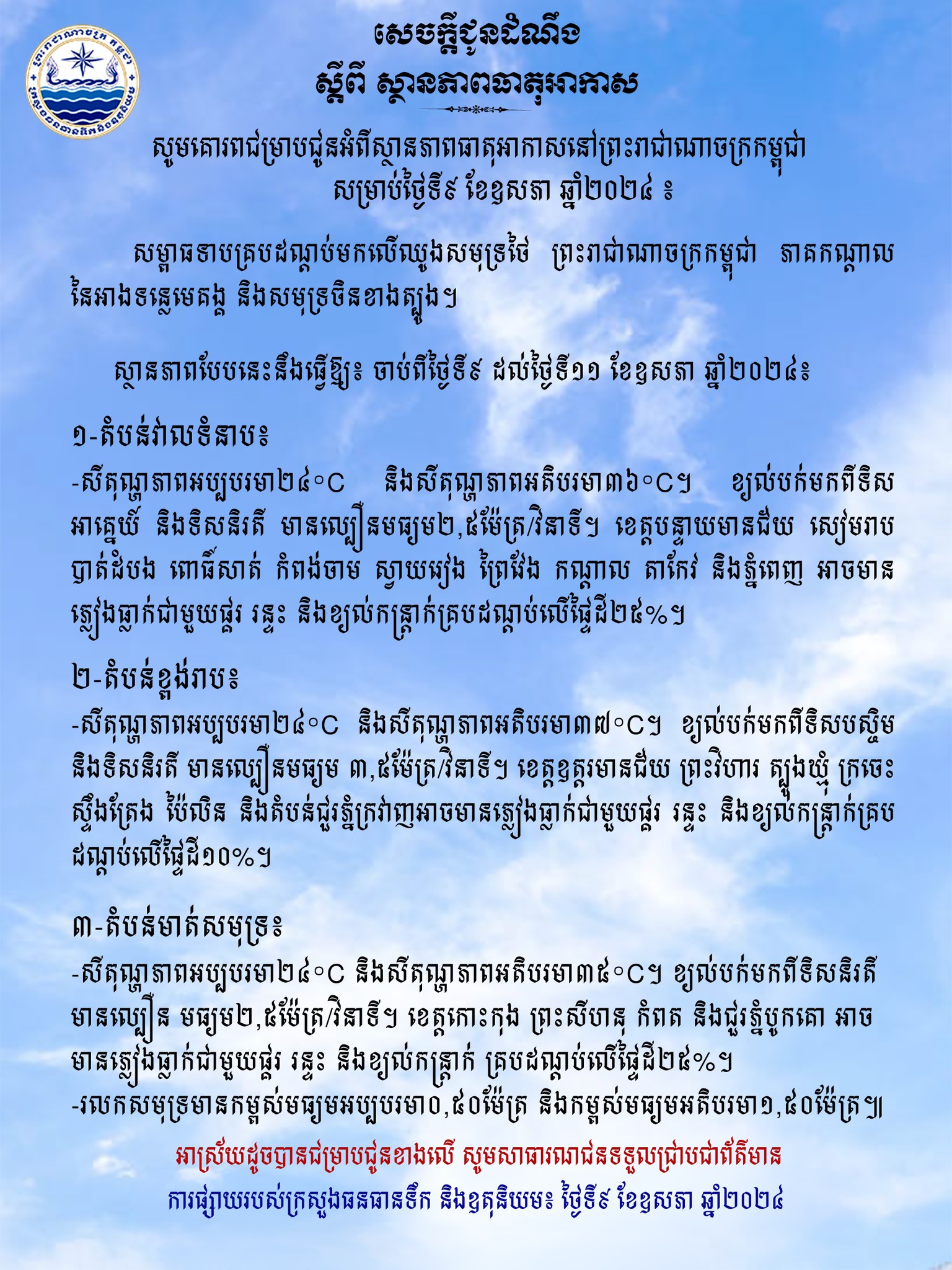 -សីតុណ្ហភាពអប្បបរមា២៤°C និងសីតុណ្ហភាពអតិបរមា៣៦°C។ ខ្យល់បក់មកពីទិសអាគ្នេយ៍ និងទិសនិរតី មានល្បឿនមធ្យម២,៥ម៉ែត្រ/វិនាទី។ ខេត្តបន្ទាយមានជ័យ សៀមរាប បាត់ដំបង ពោធិ៍សាត់ កំពង់ចាម ស្វាយរៀង ព្រៃវែង កណ្តាល តាកែវ និងភ្នំពេញ អាចមានភ្លៀងធ្លាក់ជាមួយផ្គរ រន្ទះ និងខ្យល់កន្ត្រាក់គ្របដណ្ដប់លើផ្ទៃដី២៥%។