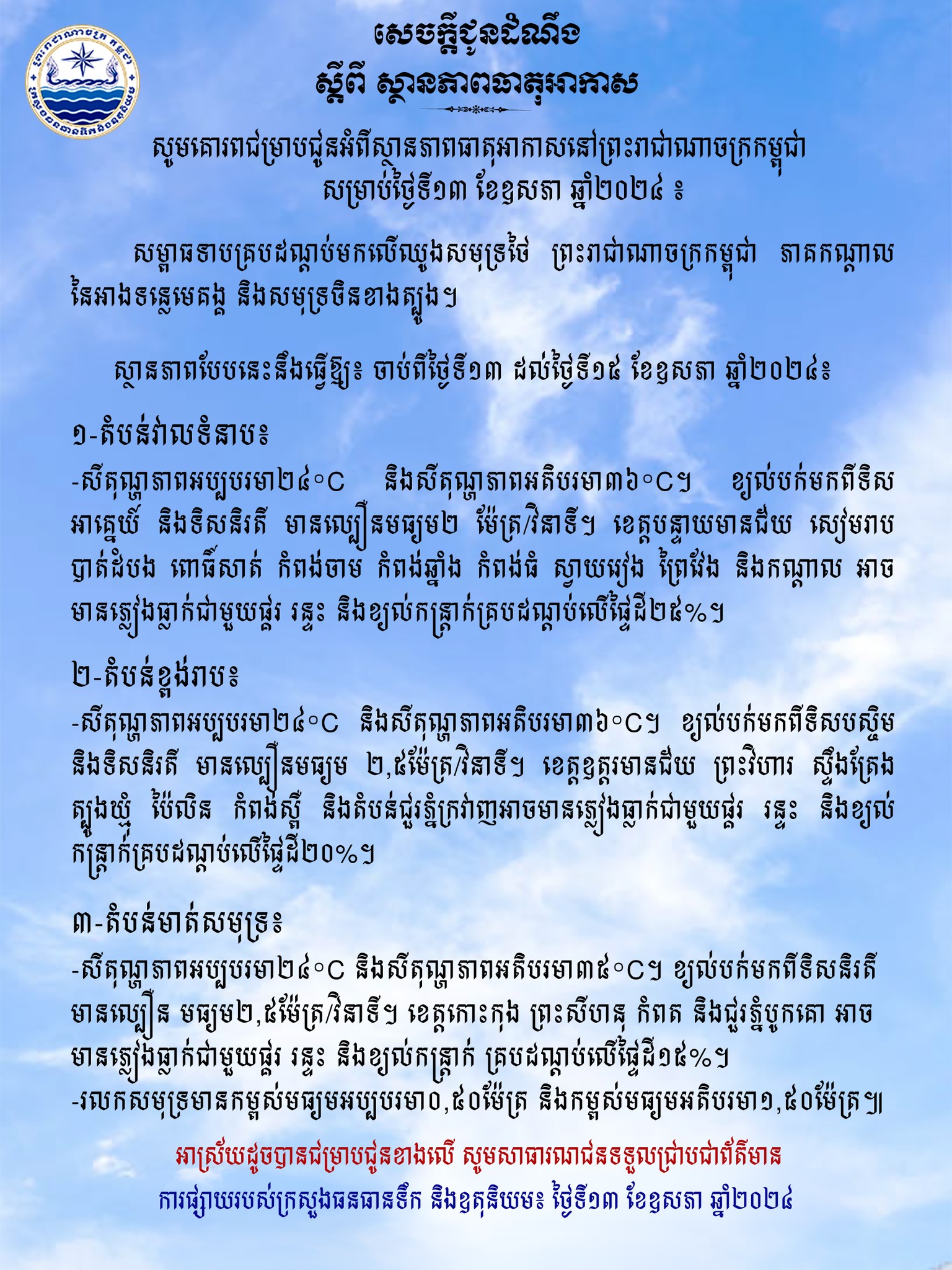 -សីតុណ្ហភាពអប្បបរមា២៤°C និងសីតុណ្ហភាពអតិបរមា៣៦°C។ ខ្យល់បក់មកពីទិសបស្ចិម និងទិសនិរតី មានល្បឿនមធ្យម ២,៥ម៉ែត្រ/វិនាទី។ ខេត្តឧត្តរមានជ័យ ព្រះវិហារ ស្ទឹងត្រែង ត្បូងឃ្មុំ ប៉ៃលិន កំពង់ស្ពឺ និងតំបន់ជួរភ្នំក្រវាញអាចមានភ្លៀងធ្លាក់ជាមួយផ្គរ រន្ទះ និងខ្យល់កន្ត្រាក់គ្របដណ្ដប់លើផ្ទៃដី២០%។