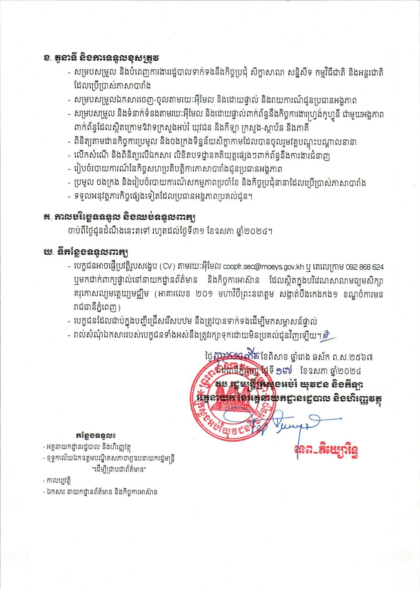 សម្រាប់បេក្ខជនអាចផ្ញើប្រវត្តិរូបសង្ខេប (CV) តាមរយៈ ៖ អ៊ីមែល coopfr.sec@moeys.gov.kh ឬតេលេក្រាម 092 868 624 ឬដាក់ពាក្យផ្ទាល់នៅនាយកដ្ឋានព័ត៌មាន និងកិច្ចការអាស៊ាន ដែលស្ថិតក្នុងបរិវេណសាលាមធ្យមសិក្សាគរុកោសល្យមត្តេយ្យមជ្ឈិម (អាគារលេខ ២០១ មហាវិថីព្រះនរោត្តម សង្កាត់បឹងកេងកង១ ខណ្ឌចំការមន រាជធានីភ្នំពេញ)។ ផុតកំណត់ទទួលពាក្យ៖ ថ្ងៃទី៣១ ខែឧសភា ឆ្នាំ២០២៤ ៕ ខាងក្រោមនេះ ជាសេចក្ដីប្រកាសព័ត៌មានលម្អិតរបស់ ក្រសួងអប់រំ យុវជន និងកីឡា៖