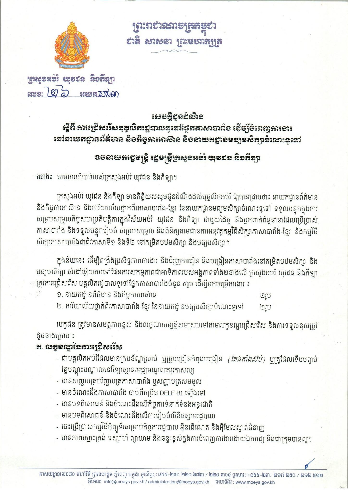 រាជធានីភ្នំពេញ៖ នៅថ្ងៃទី១៧ ខែឧសភា ឆ្នាំ២០២៤ យោងតាមការចុះផ្សាយរបស់ ក្រសួងអប់រំ យុវជន និងកីឡា បានចេញសេចក្ដីជូនដំណឹង ស្ដីពីការជ្រើសរើសបុគ្គលិករដ្ឋបាលទូទៅផ្នែកភាសាបារាំង ដើម្បីបំពេញការងារនៅនាយកដ្ឋានព័ត៌មាន និងកិច្ចការអាស៊ាន និងនាយកដ្ឋានមធ្យមសិក្សាចំណេះទូទៅ នៃក្រសួងអប់រំ យុវជន និងកីឡា។