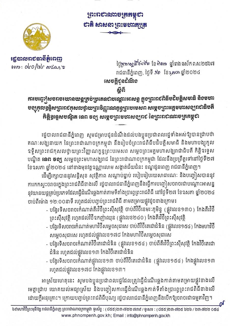 ដើម្បីរក្សាបាននូវសន្តិសុខ សុវត្ថិភាព សណ្តាប់ធ្នាប់ របៀបរៀបរយសាធារណៈ និងបញ្ចៀសបាននូវ ការកកស្ទះចរាចរក្នុងព្រះរាជពិធីខាងលើ រដ្ឋបាលរាជធានីភ្នំពេញនឹងធ្វើការបញ្ចៀសចរាចរជាបណ្តោះអាសន្ន នូវយានយន្តគ្រប់ប្រភេទដែលធ្វើដំណើរឆ្លងកាត់តាមទីតាំងប្រារព្ធព្រះរាជពិធី នៅថ្ងៃទី២៧ ខែឧសភា ឆ្នាំ២០២៤ ចាប់ពីម៉ោង១២៖០០នាទី រហូតដល់បញ្ចប់ព្រះរាជពិធី តាមតម្រាយផ្លូវដូចខាងក្រោម៖
