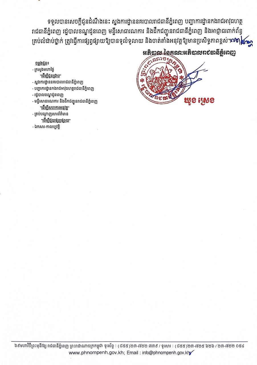 អាស្រ័យហេតុនេះ សូមបងប្អូនប្រជាពលរដ្ឋដែលត្រូវធ្វើដំណើរឆ្លងកាត់តាមតម្រាយផ្លូវខាងលើ មេត្តាជ្រាប យោគយល់អធ្យាស្រ័យ និងបញ្ចៀសការធ្វើដំណើរឆ្លងកាត់ទីតាំងប្រារព្ធព្រះរាជពិធីខាងលើ ដោយក្ដីអនុគ្រោះ។ ក្រោយបញ្ចប់ព្រះរាជពិធីបុណ្យ រដ្ឋបាលរាជធានីភ្នំពេញនឹងបើកឱ្យចរាចរជាធម្មតាវិញ ៕