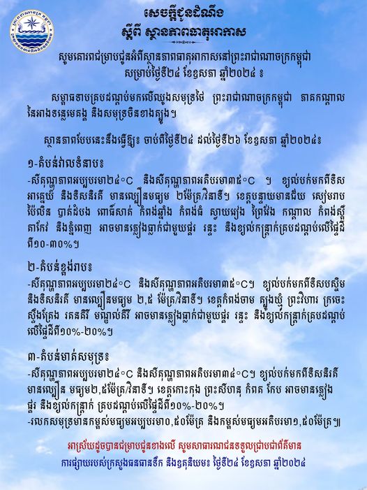 -សីតុណ្ហភាពអប្បបរមា២៤°C និងសីតុណ្ហភាពអតិបរមា៣៥°C ។ ខ្យល់បក់មកពីទិស អាគ្នេយ៍ និងទិសនិរតី មានល្បឿនមធ្យម ២ម៉ែត្រ/វិនាទី។ ខេត្តបន្ទាយមានជ័យ សៀមរាប ប៉ៃលិន បាត់ដំបង ពោធិ៍សាត់ កំពង់ឆ្នាំង កំពង់ធំ ស្វាយរៀង ព្រៃវែង កណ្តាល កំពង់ស្ពឺ តាកែវ និងភ្នំពេញ អាចមានភ្លៀងធ្លាក់ជាមួយផ្គរ រន្ទះ និងខ្យល់កន្ត្រាក់គ្របដណ្តប់លើផ្ទៃដី ពី១០-៣០%។