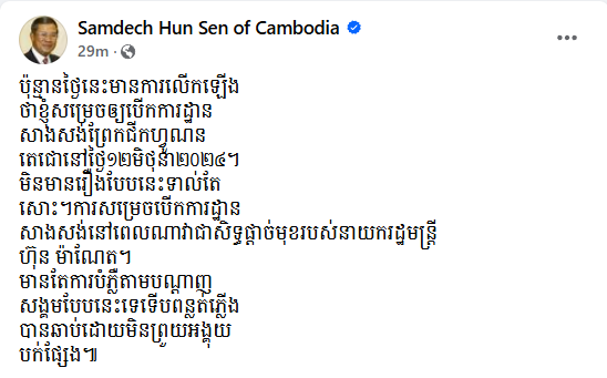 បើយោងតាមរយៈខ្លឹមសារបង្ហោះរបស់ សម្តេចតេជោ ហ៊ុន សែន បានបញ្ជាក់យ៉ាងដូច្នេះថា៖ «ប៉ុន្មានថ្ងៃនេះមានការលើកឡើងថាខ្ញុំសម្រេចឲ្យបើកការដ្ឋានសាងសង់ព្រែកជីកហ្វូណនតេជោនៅថ្ងៃ១២ ខែមិថុនា ឆ្នាំ២០២៤។ មិនមានរឿងបែបនេះទាល់តែសោះ។ ការសម្រេចបើកការដ្ឋានសាងសង់នៅពេលណាវាជាសិទ្ធផ្តាច់មុខរបស់នាយករដ្ឋមន្ត្រី ហ៊ុន ម៉ាណែត។ មានតែការបំភ្លឺតាមបណ្តាញសង្គមបែបនេះទេទើបពន្លត់ភ្លើងបានឆាប់ ដោយមិនព្រួយអង្គុយបក់ផ្សែង» ៕