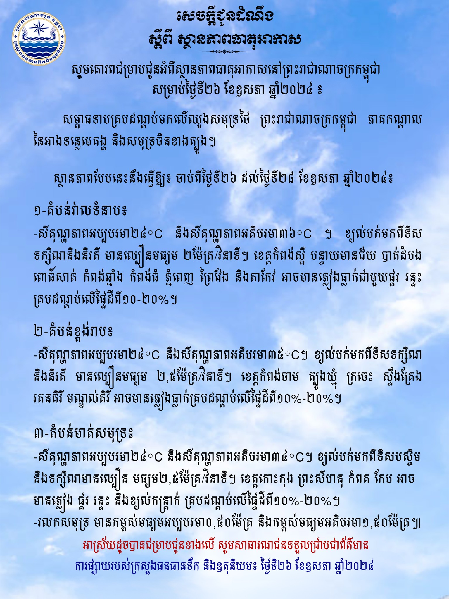 – សីតុណ្ហភាពអប្បបរមា ២៤°C និងសីតុណ្ហភាពអតិបរមា៣៦°C ។ ខ្យល់បក់មកពីទិសទក្សិណ និងនិរតី មានល្បឿនមធ្យម ២ ម៉ែត្រ/វិនាទី។ ខេត្តកំពង់ស្ពឺ បន្ទាយមានជ័យ បាត់ដំបង ពោធិ៍សាត់ កំពង់ឆ្នាំង កំពង់ធំ ភ្នំពេញ ព្រៃវែង និងតាកែវ អាចមានភ្លៀងធ្លាក់ជាមួយផ្គរ រន្ទះ និងខ្យល់កន្ត្រាក់គ្របដណ្ដប់លើផ្ទៃដី១០-២០%។